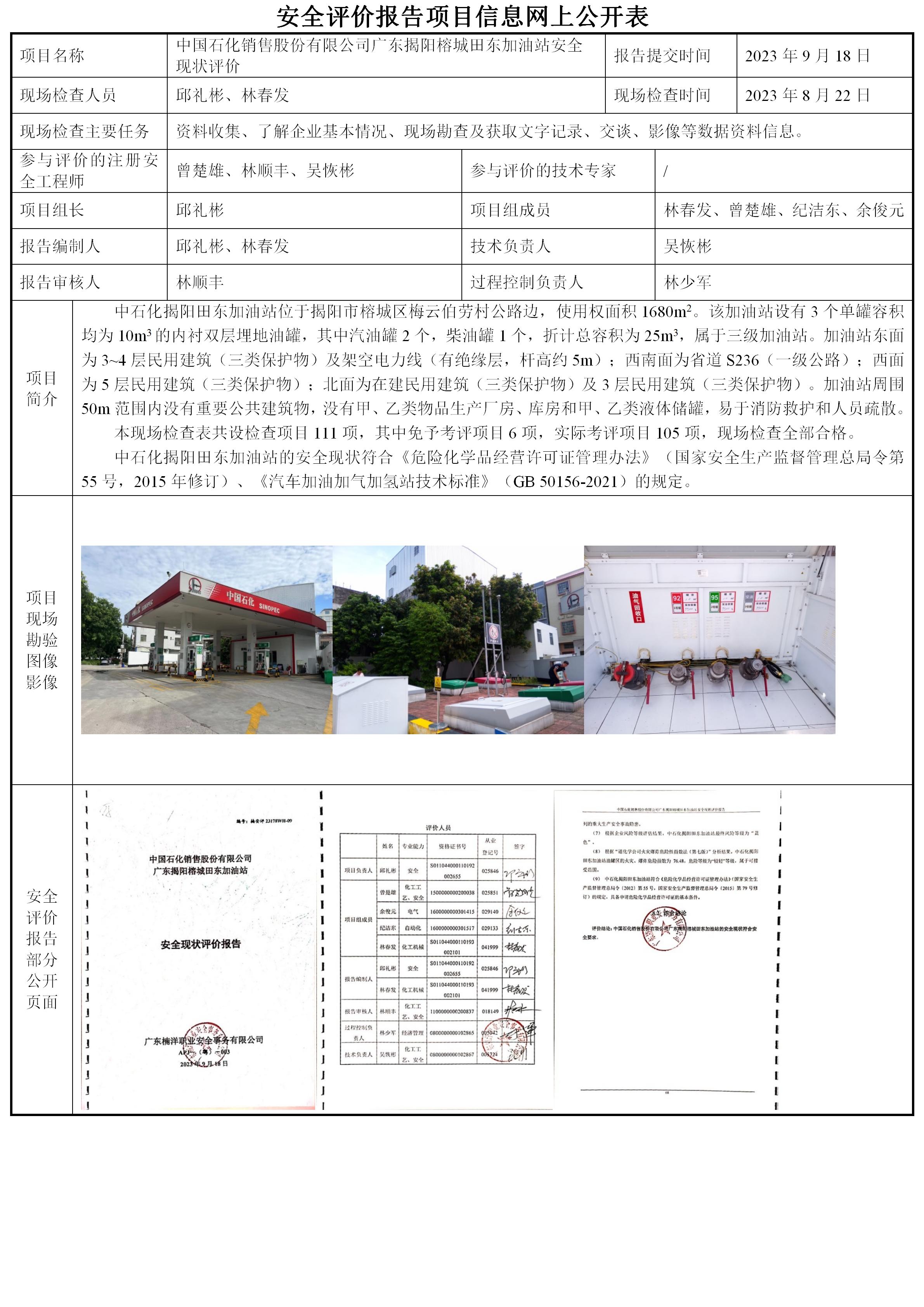 中国石化销售股份有限公司广东揭阳榕城田东加油站安全现状评价