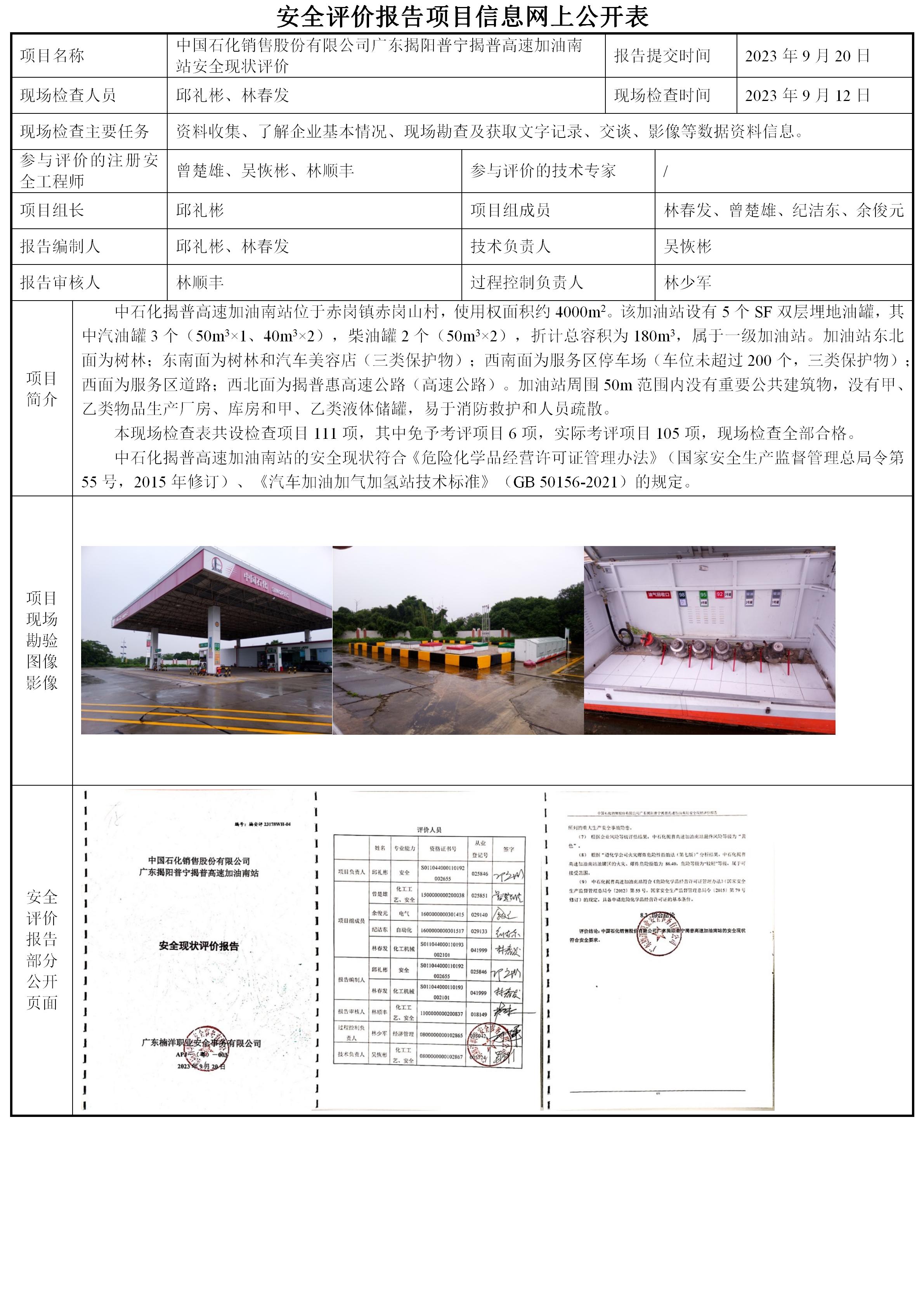 中国石化销售股份有限公司广东揭阳普宁揭普高速加油南站安全现状评价