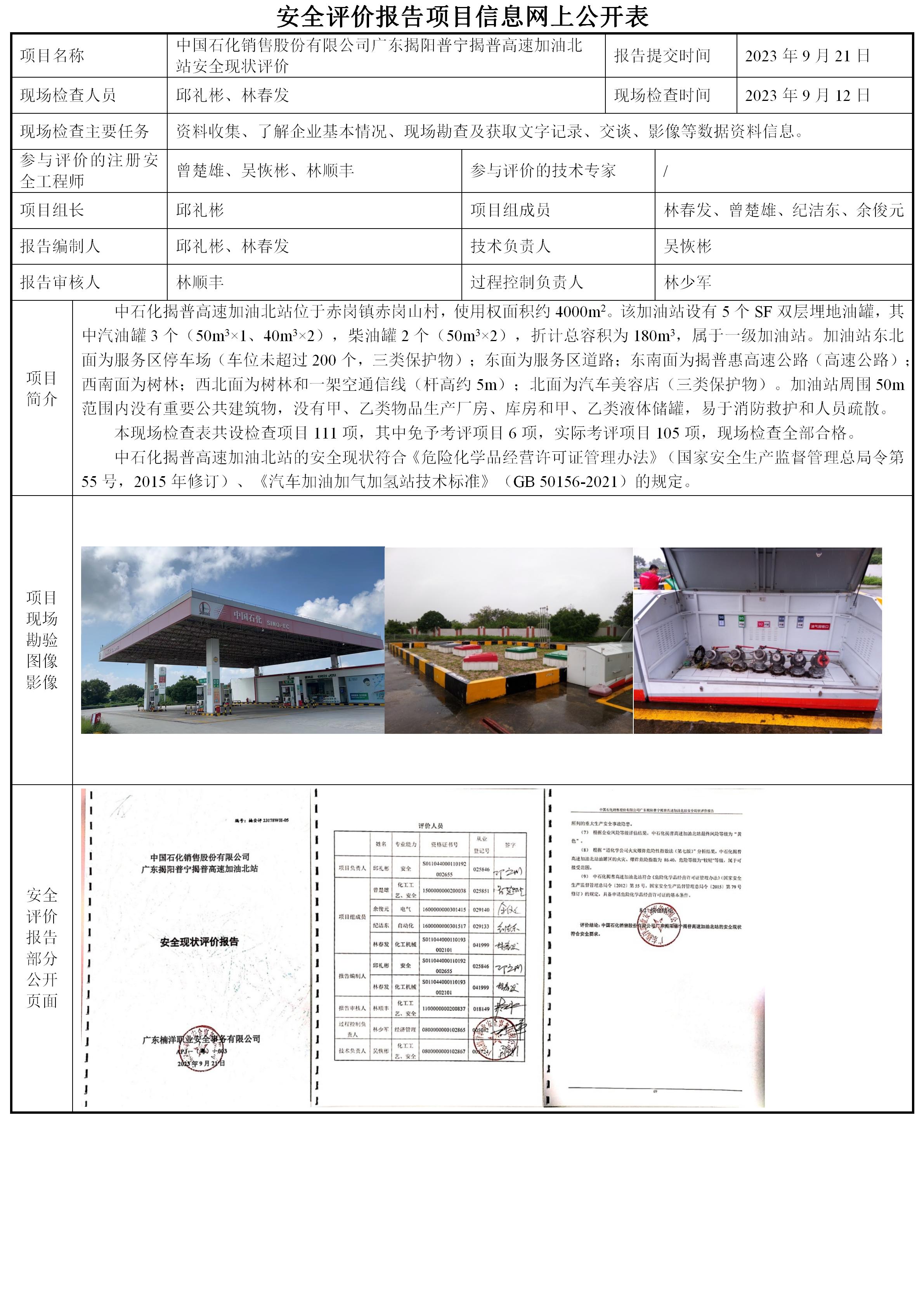 中国石化销售股份有限公司广东揭阳普宁揭普高速加油北站安全现状评价