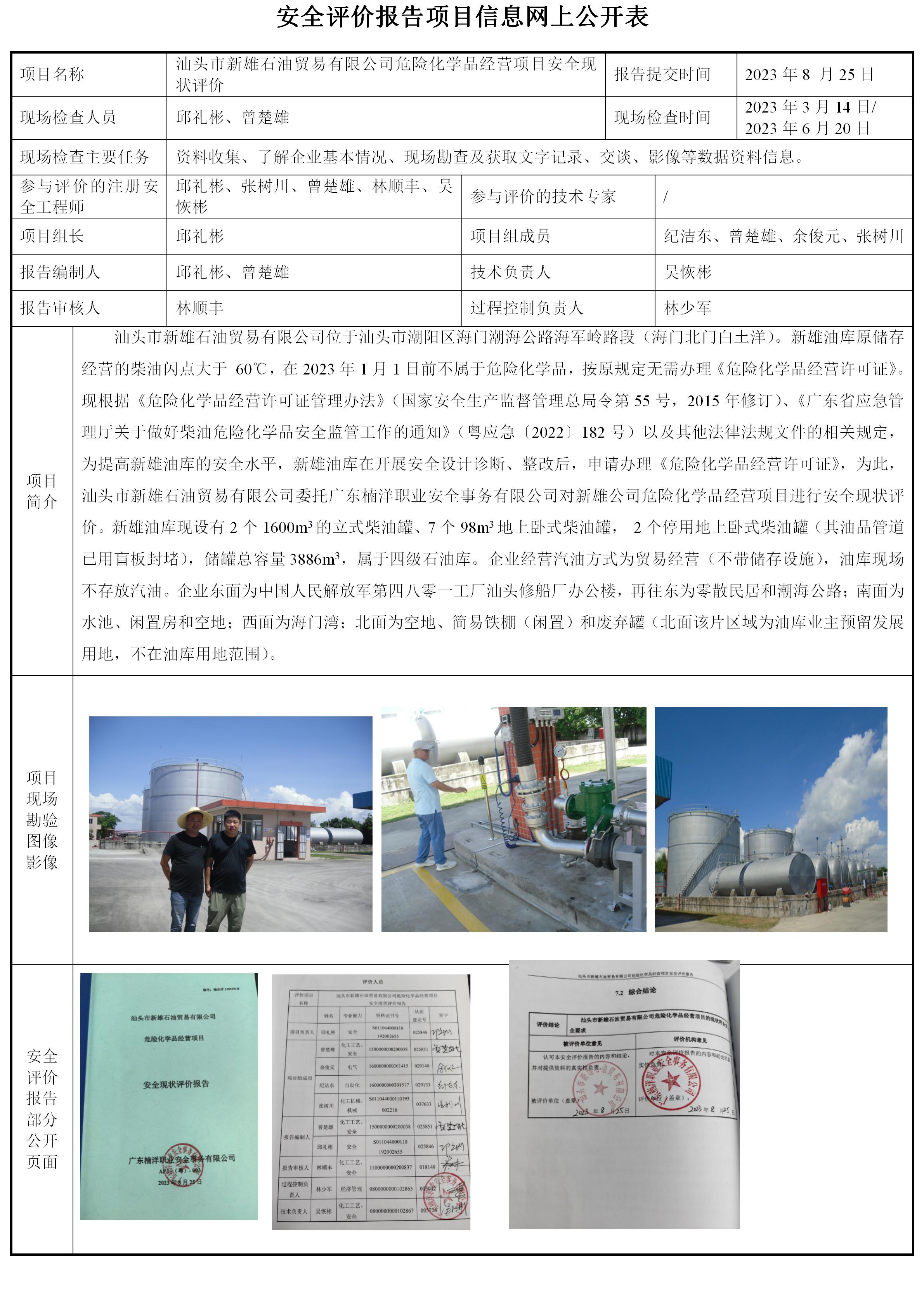 汕头市新雄石油贸易有限公司(新雄油库)安全现状评价