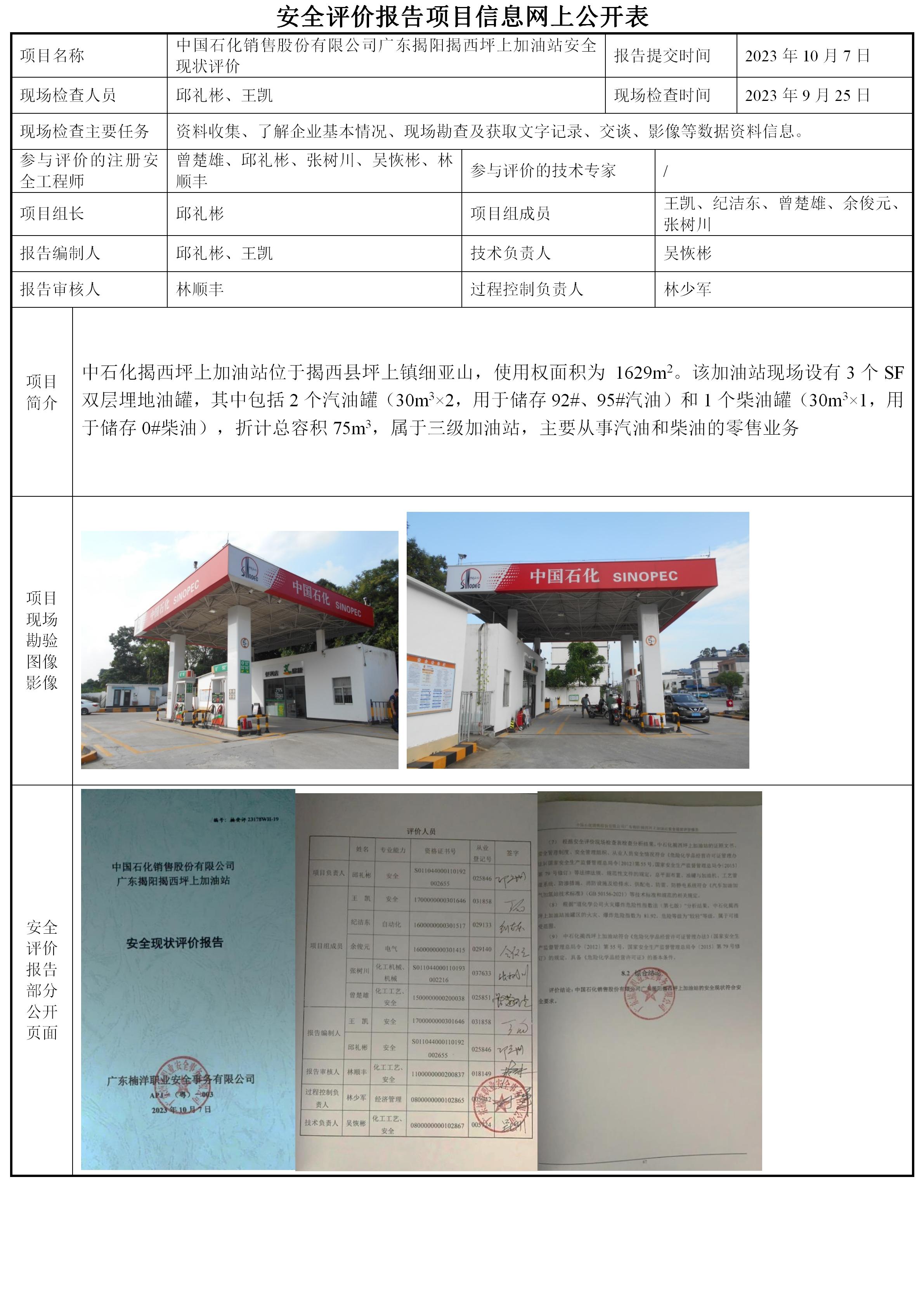 中国石化销售股份有限公司广东揭阳揭西坪上加油站安全现状评价
