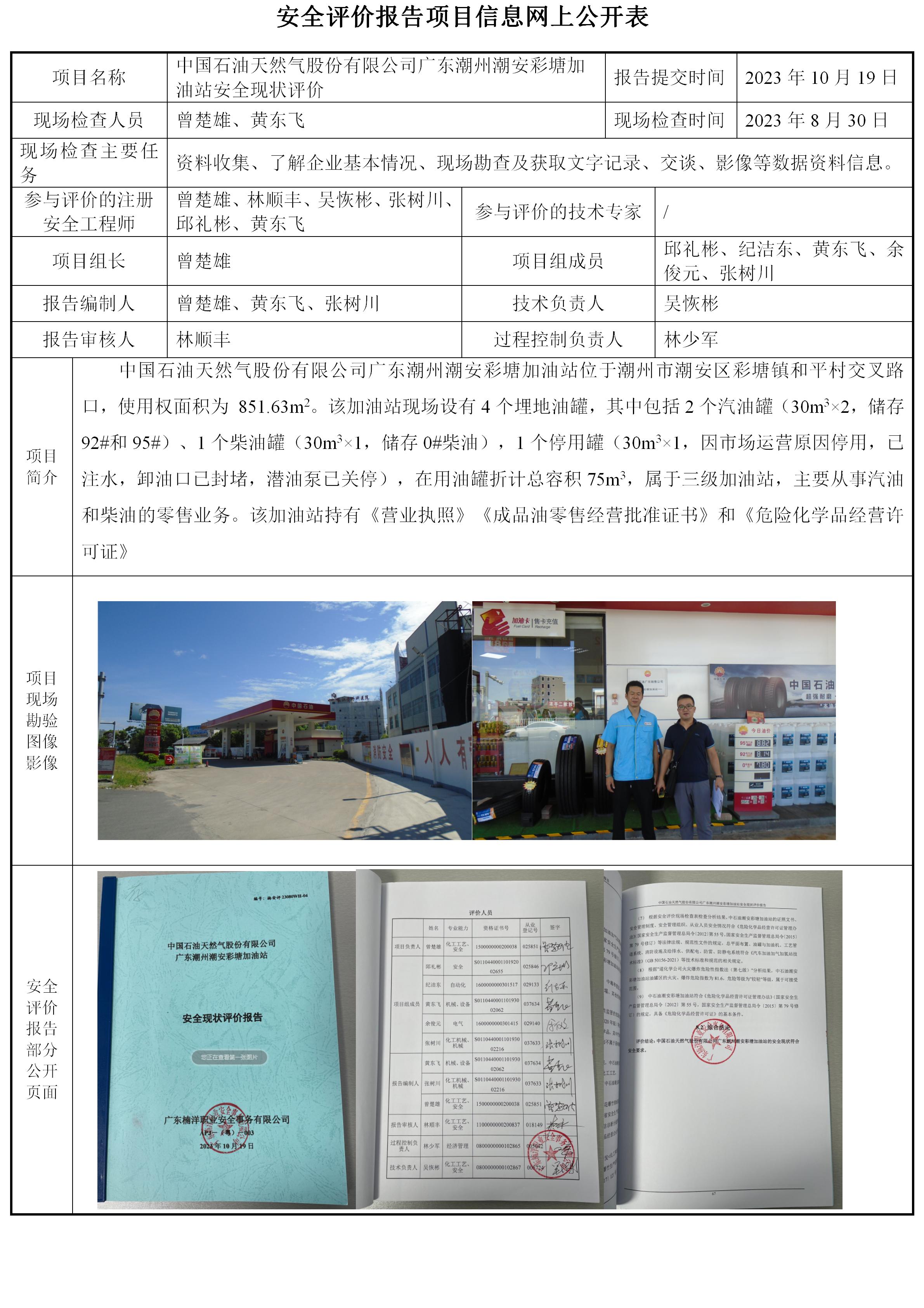 中国石油天然气股份有限公司广东潮州潮安彩塘加油站安全现状评价