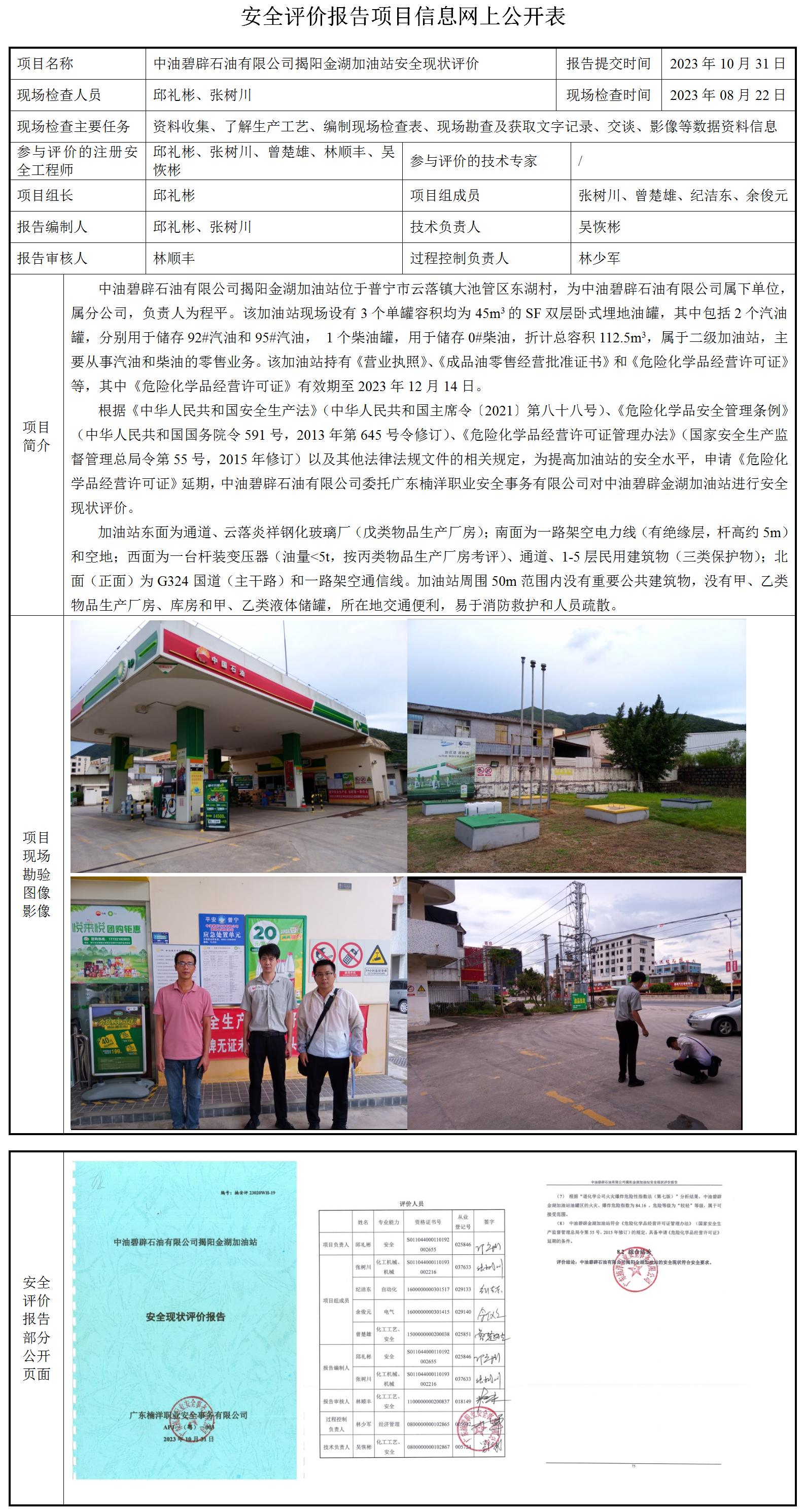 中油碧辟石油有限公司揭阳金湖加油站安全现状评价