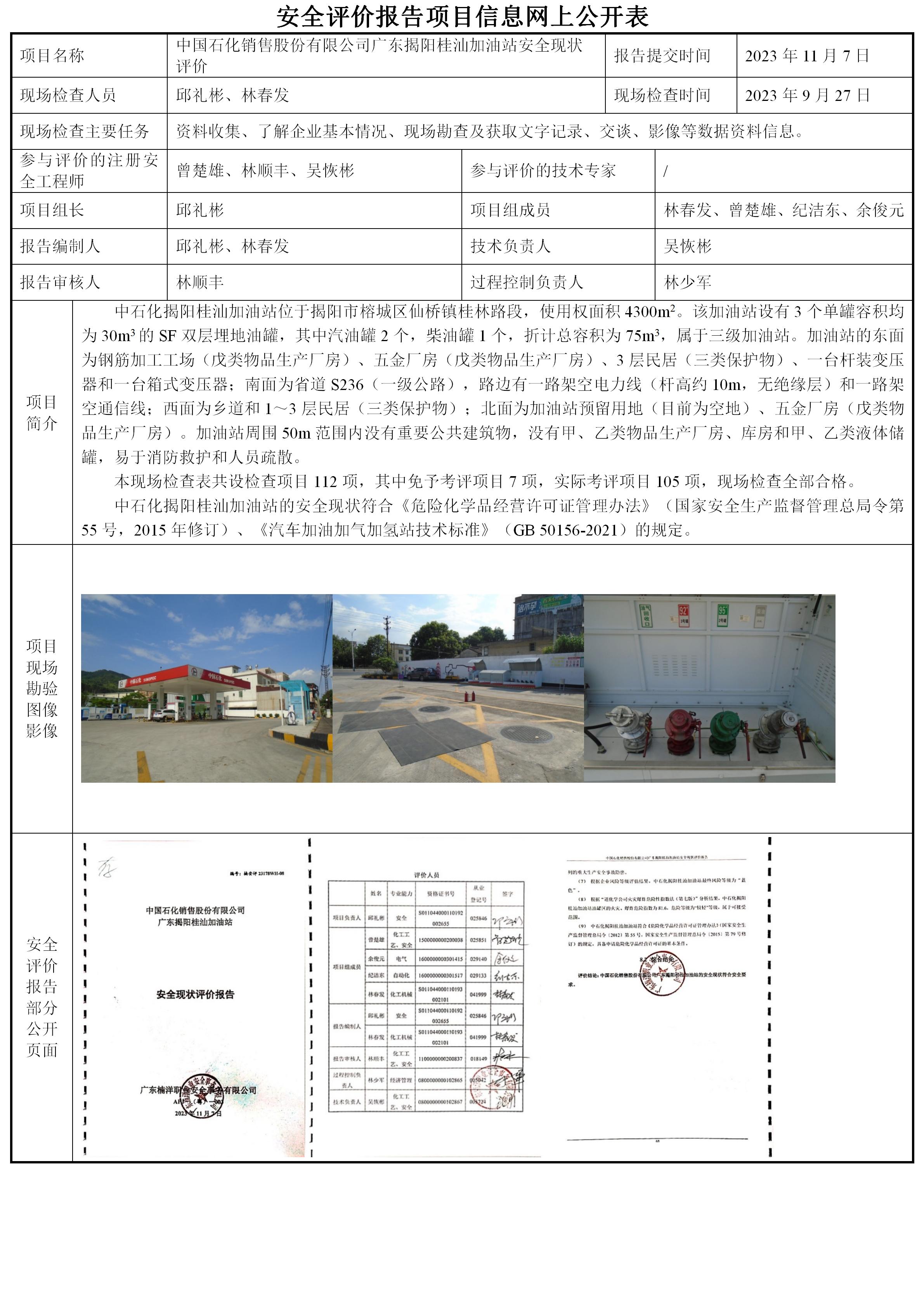 中国石化销售股份有限公司广东揭阳桂汕加油站安全现状评价
