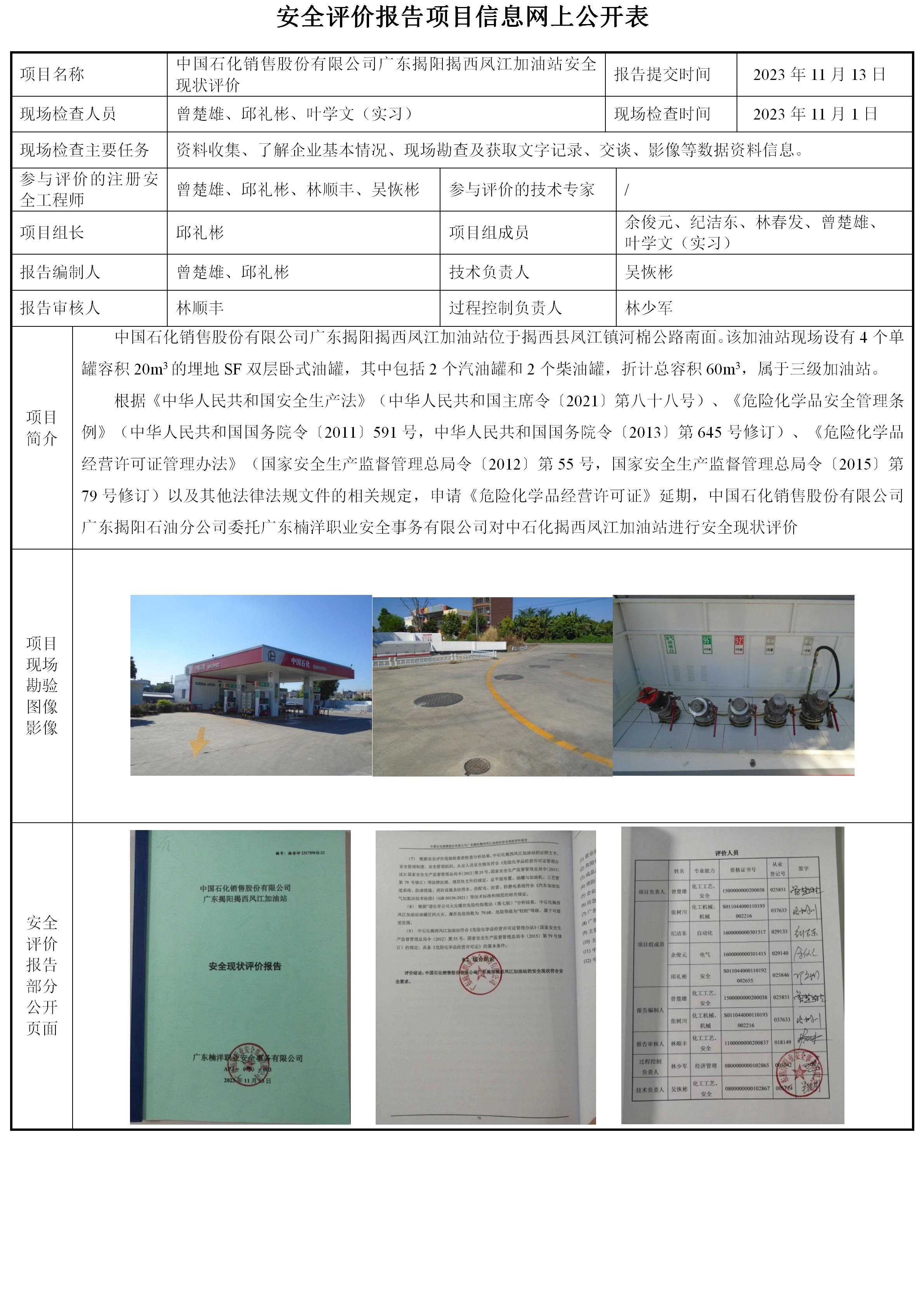 中国石化销售股份有限公司广东揭阳揭西凤江加油站安全现状评价