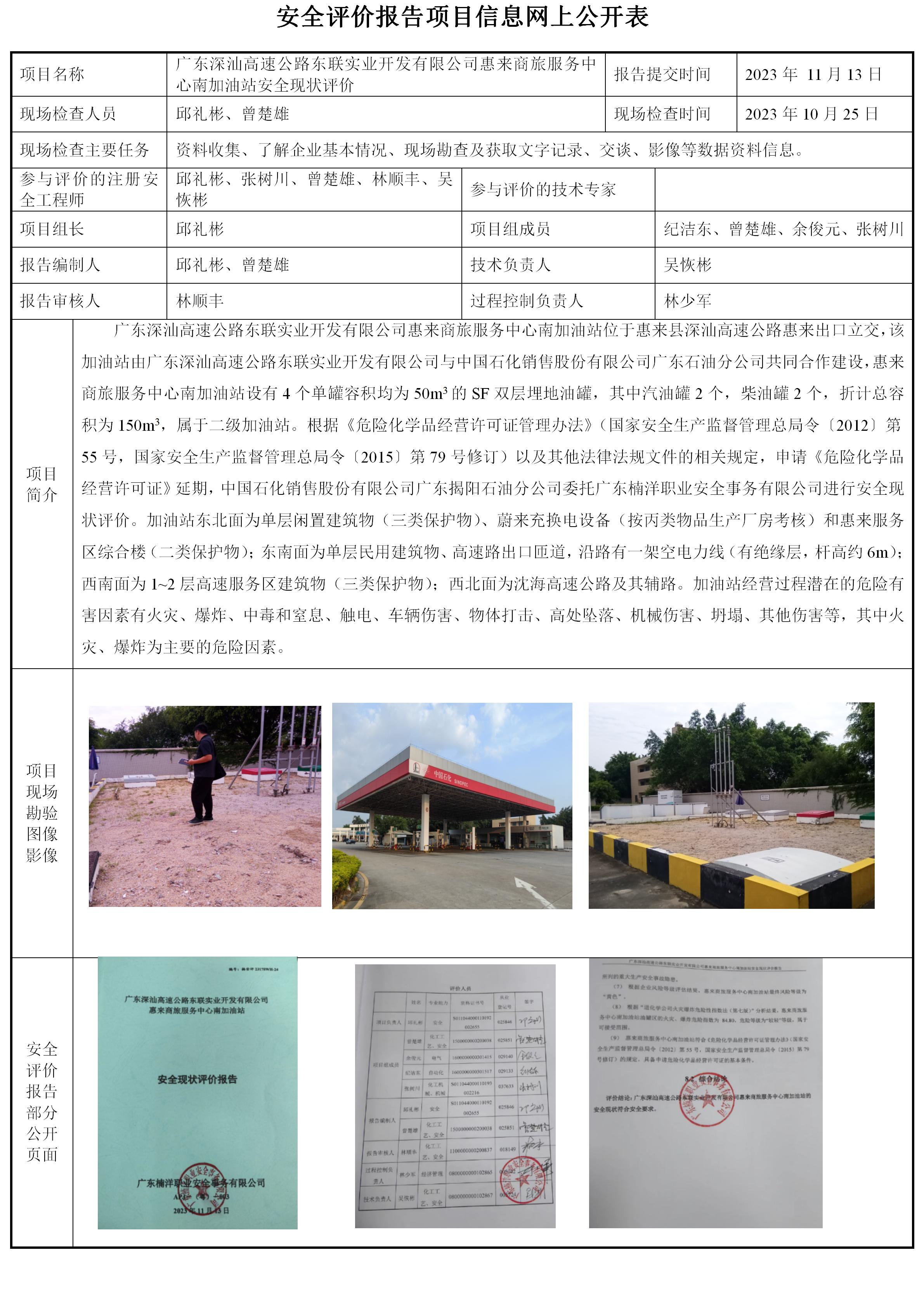 广东深汕高速公路东联实业开发有限公司惠来商旅服务中心南加油站安全现状评价