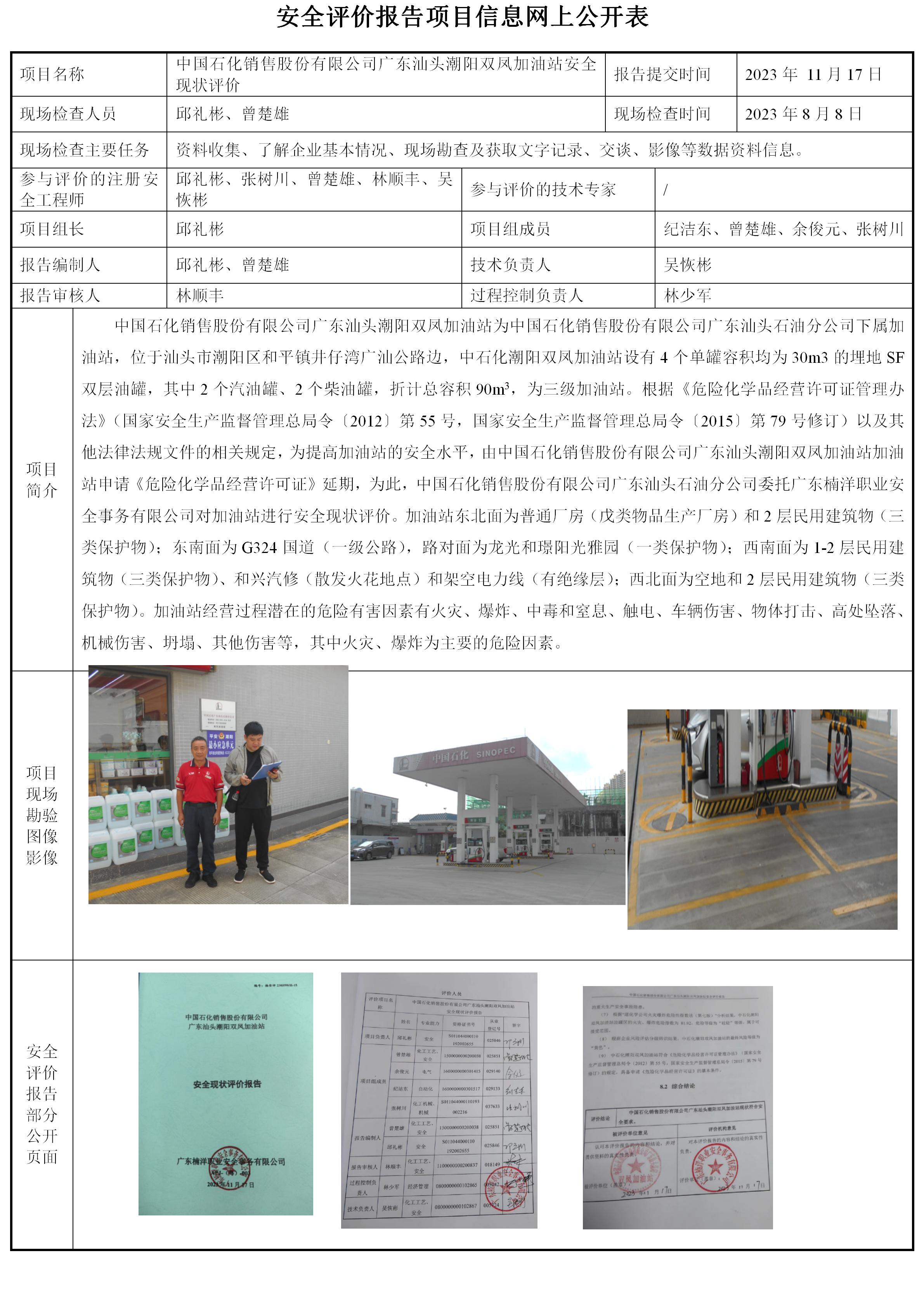 中国石化销售股份有限公司广东汕头潮阳双凤加油站安全现状评价