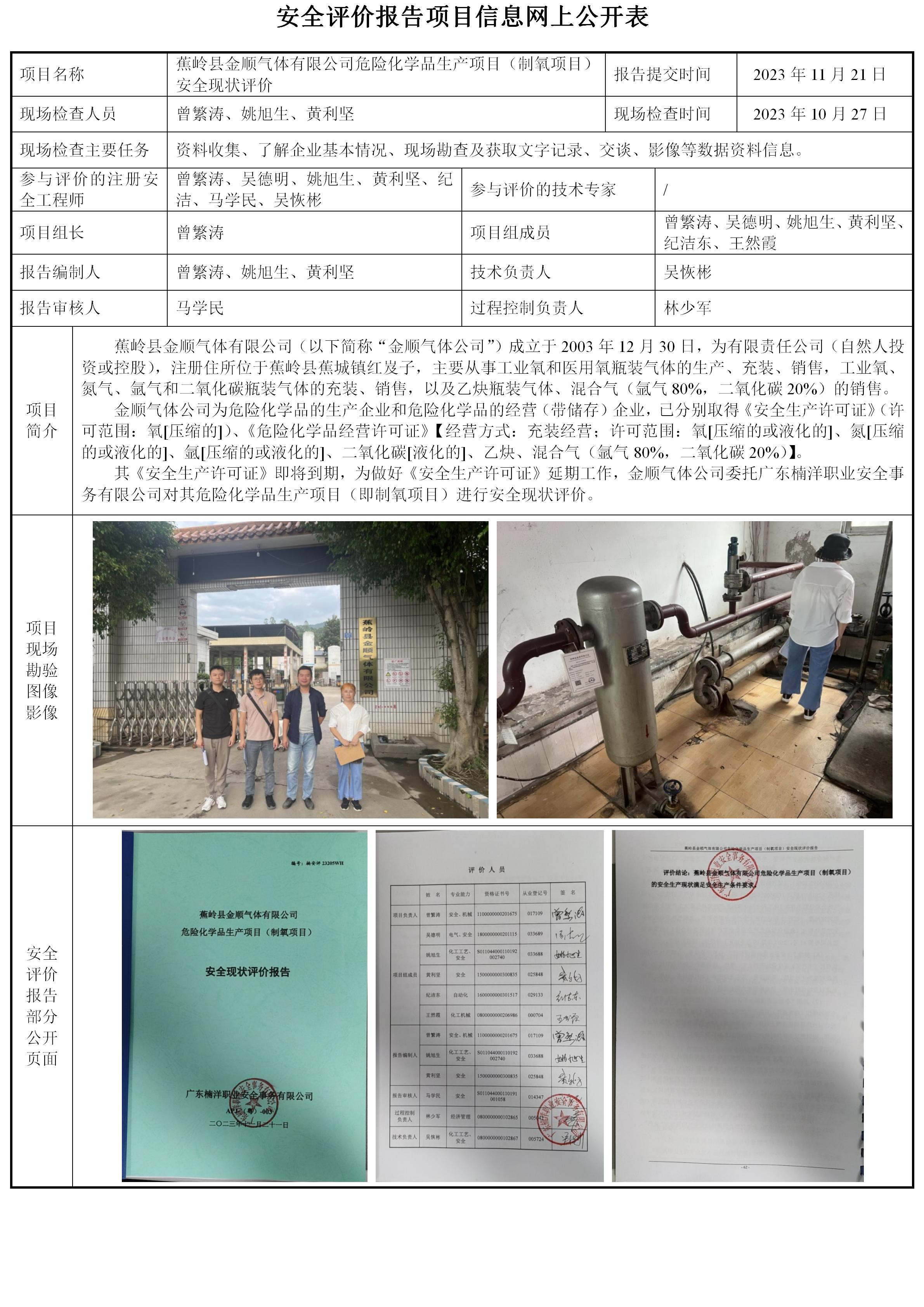 蕉岭县金顺气体有限公司危险化学品生产项目(制氧项目)安全现状评价