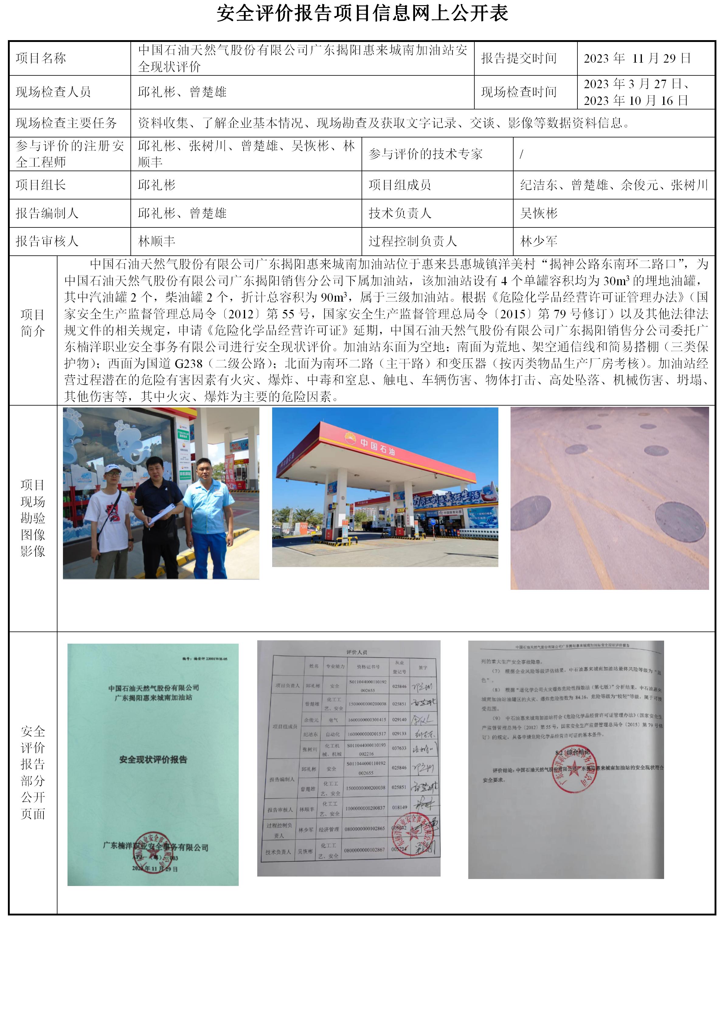 中国石油天然气股份有限公司广东揭阳惠来城南加油站安全现状评价