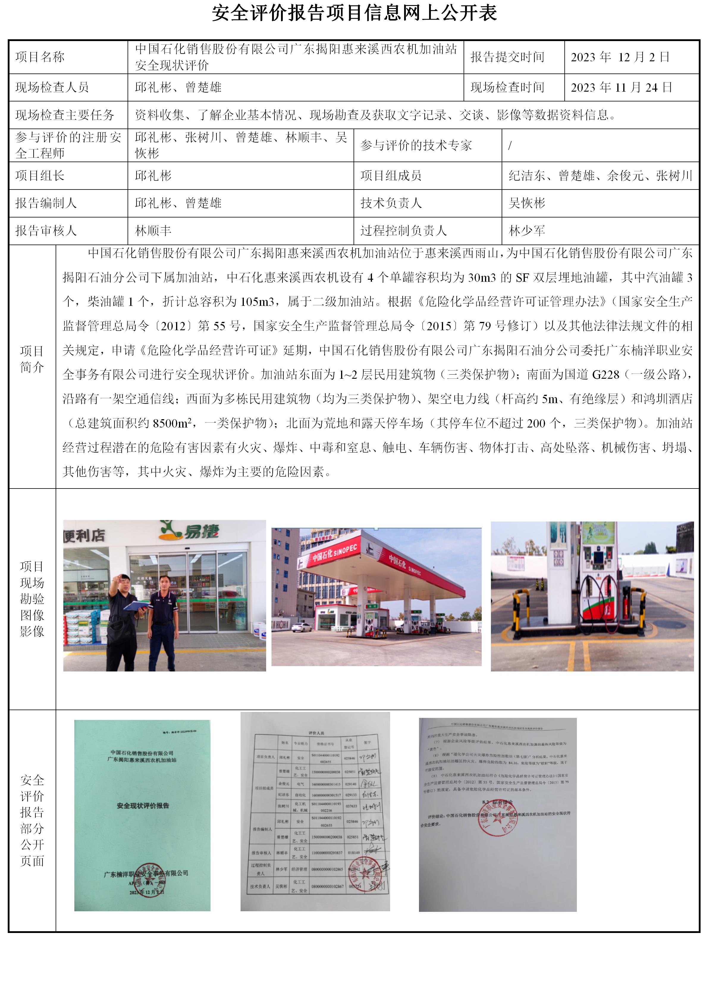 中国石化销售股份有限公司广东揭阳惠来溪西农机加油站安全现状评价