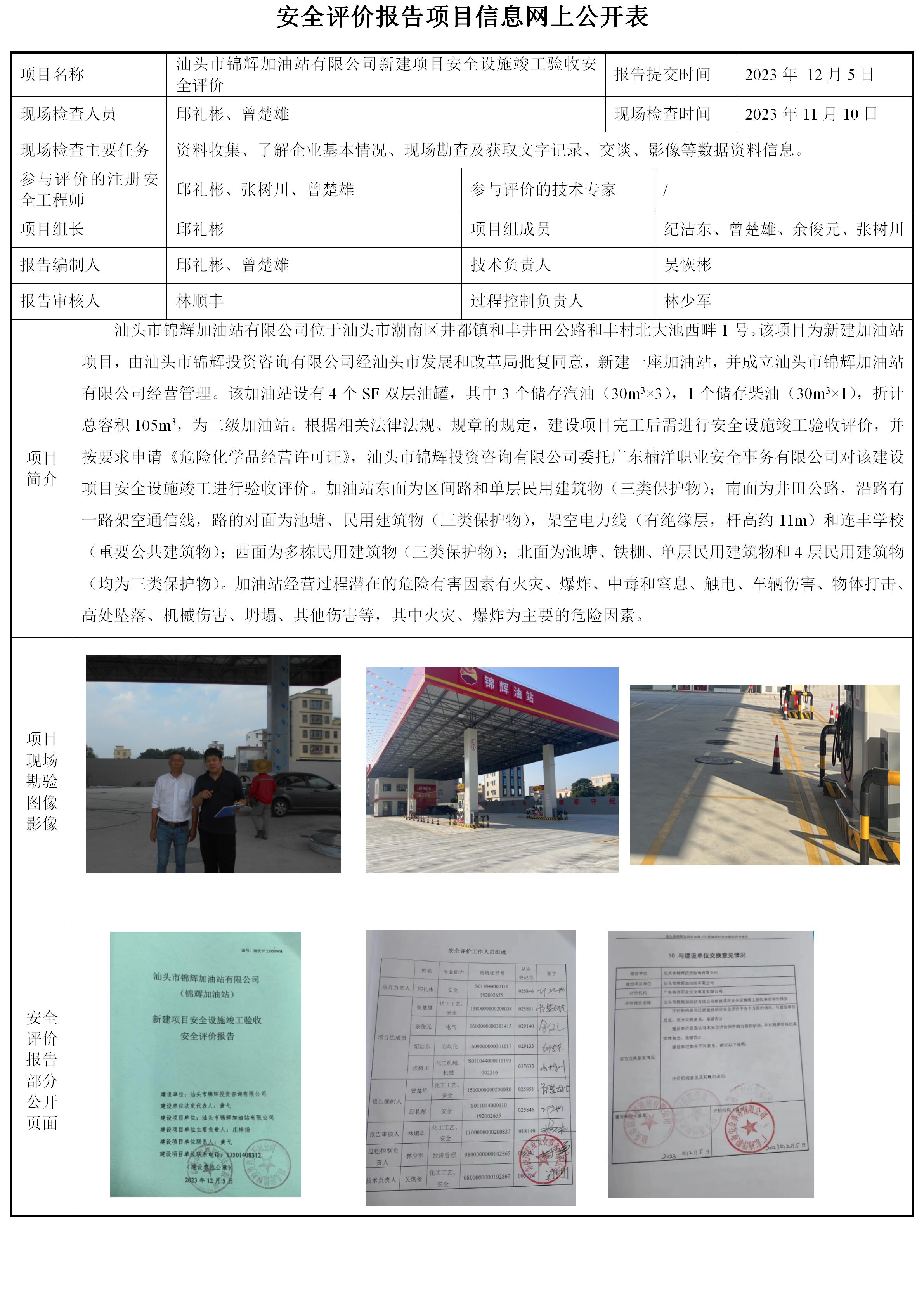 汕头市锦辉加油站有限公司(锦辉加油站)新建项目安全设施竣工验收安全评价
