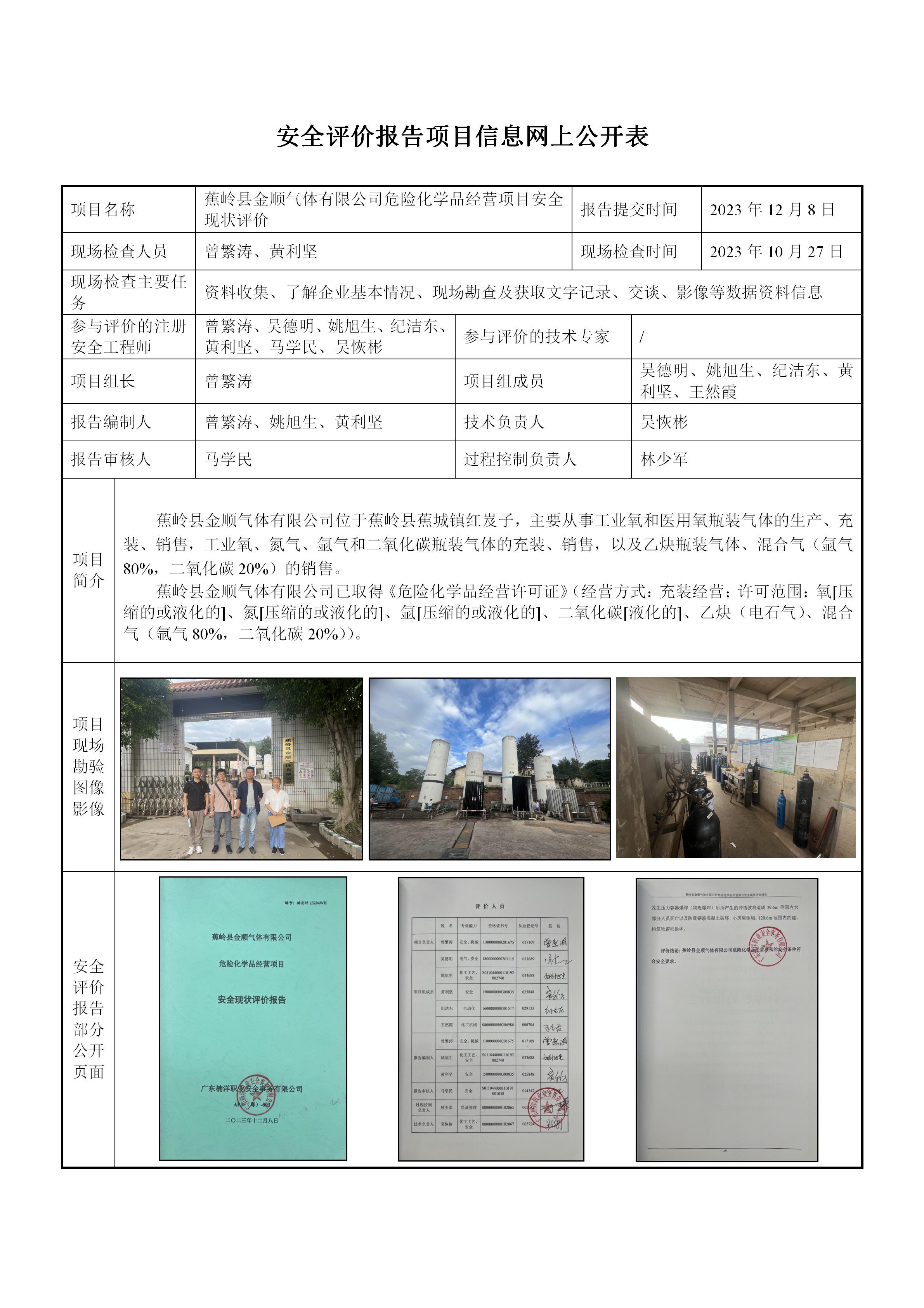 蕉岭县金顺气体有限公司危险化学品经营项目安全现状评价