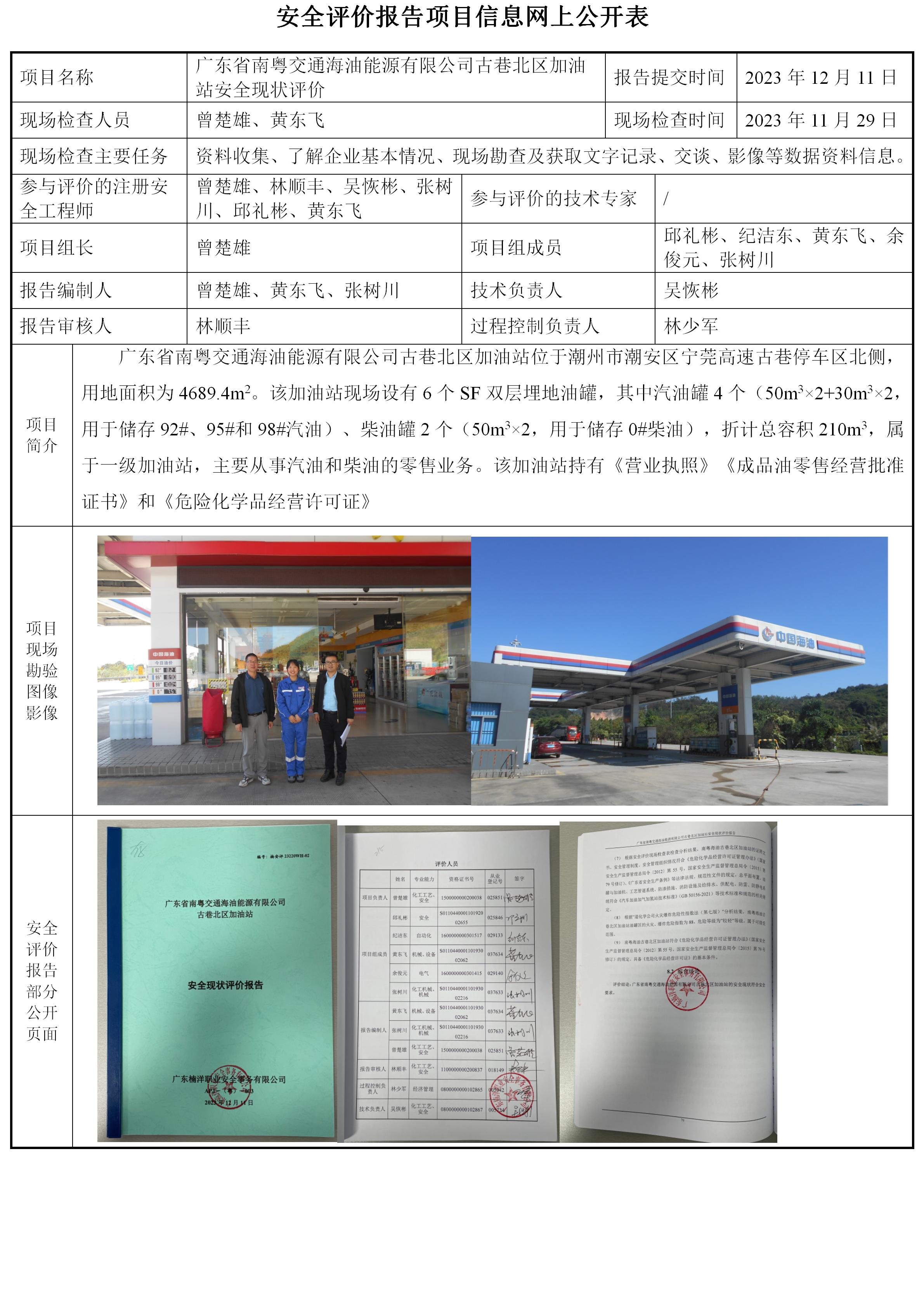 广东省南粤交通海油能源有限公司古巷北区加油站安全现状评价