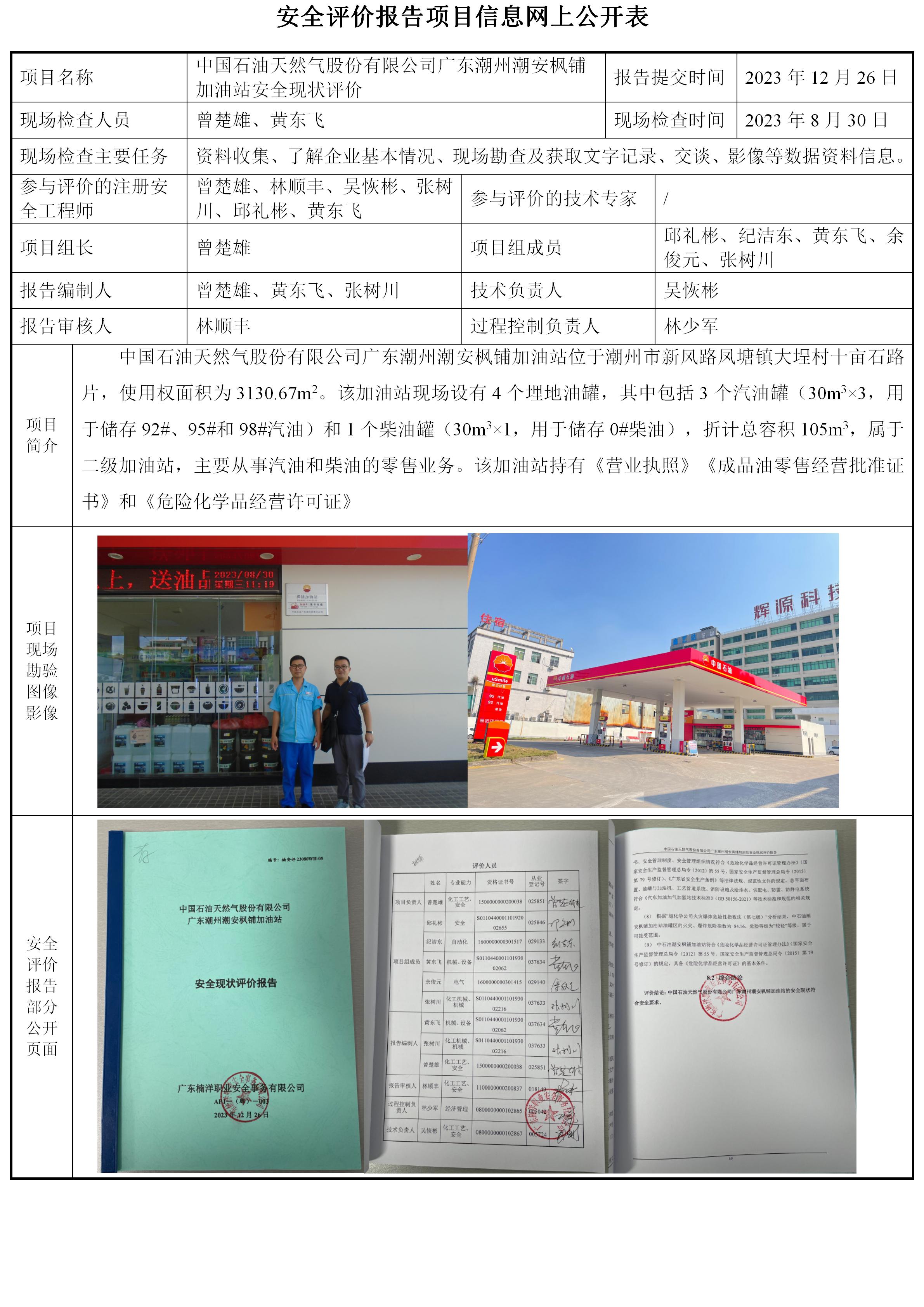 中国石油天然气股份有限公司广东潮州潮安枫铺加油站安全现状评价