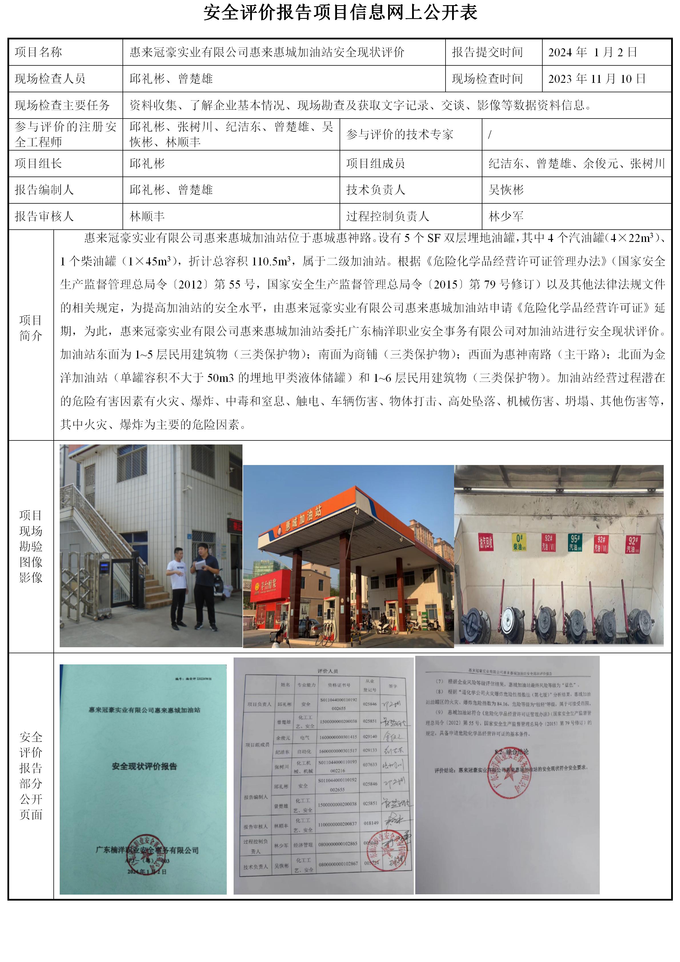 惠来冠豪实业有限公司惠来惠城加油站安全现状评价