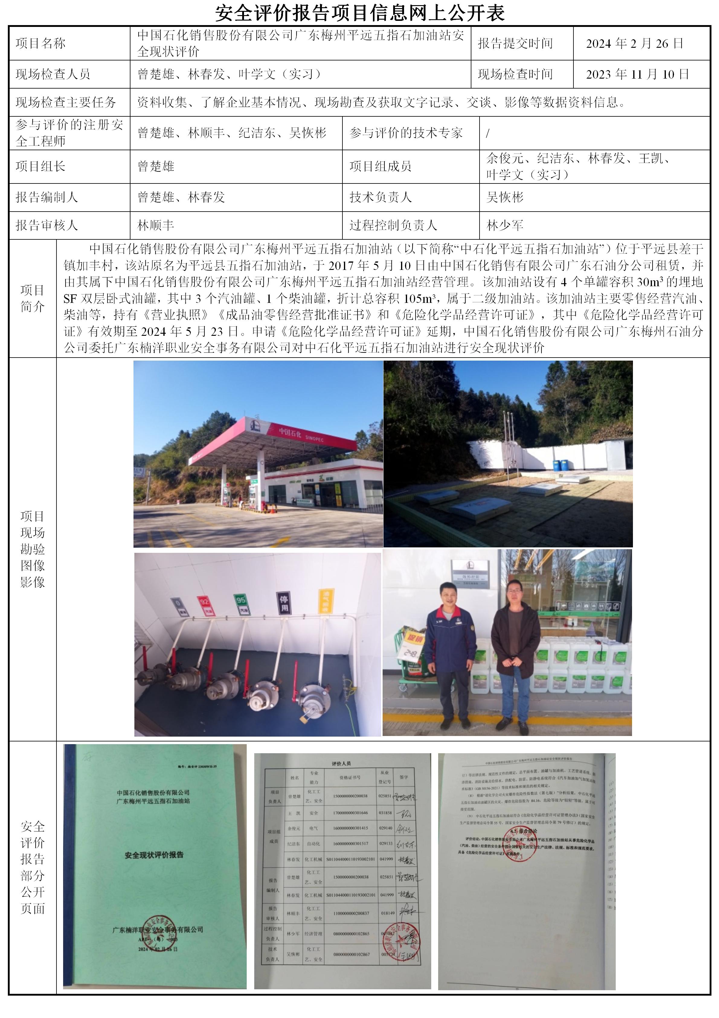 中国石化销售股份有限公司广东梅州平远五指石加油站安全现状评价