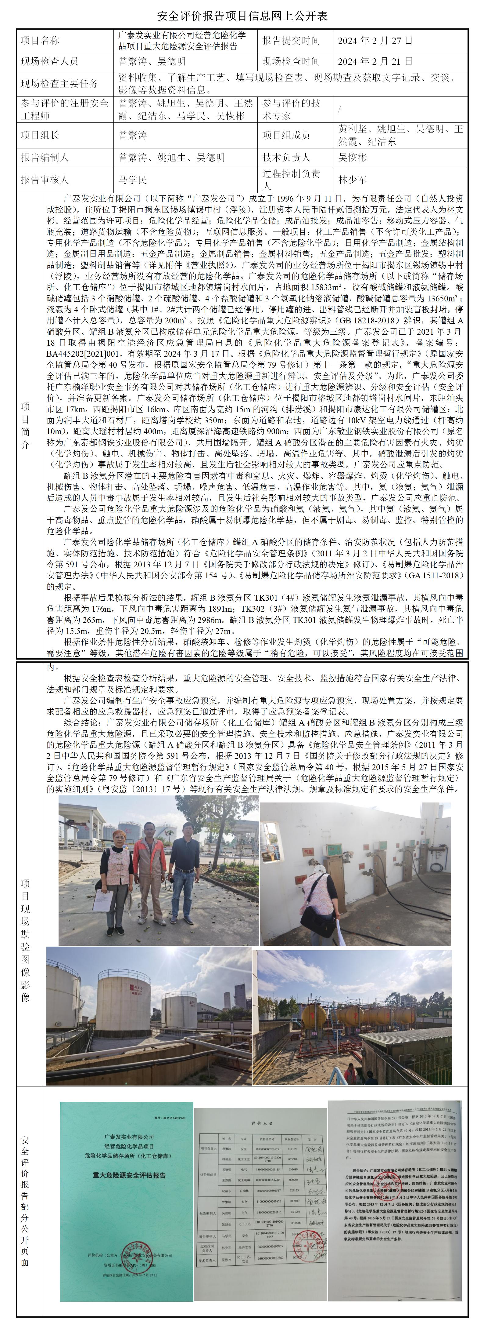 广泰发实业有限公司经营危险化学品项目危险化学品储存场所(化工仓储库)重大危险源安全评估