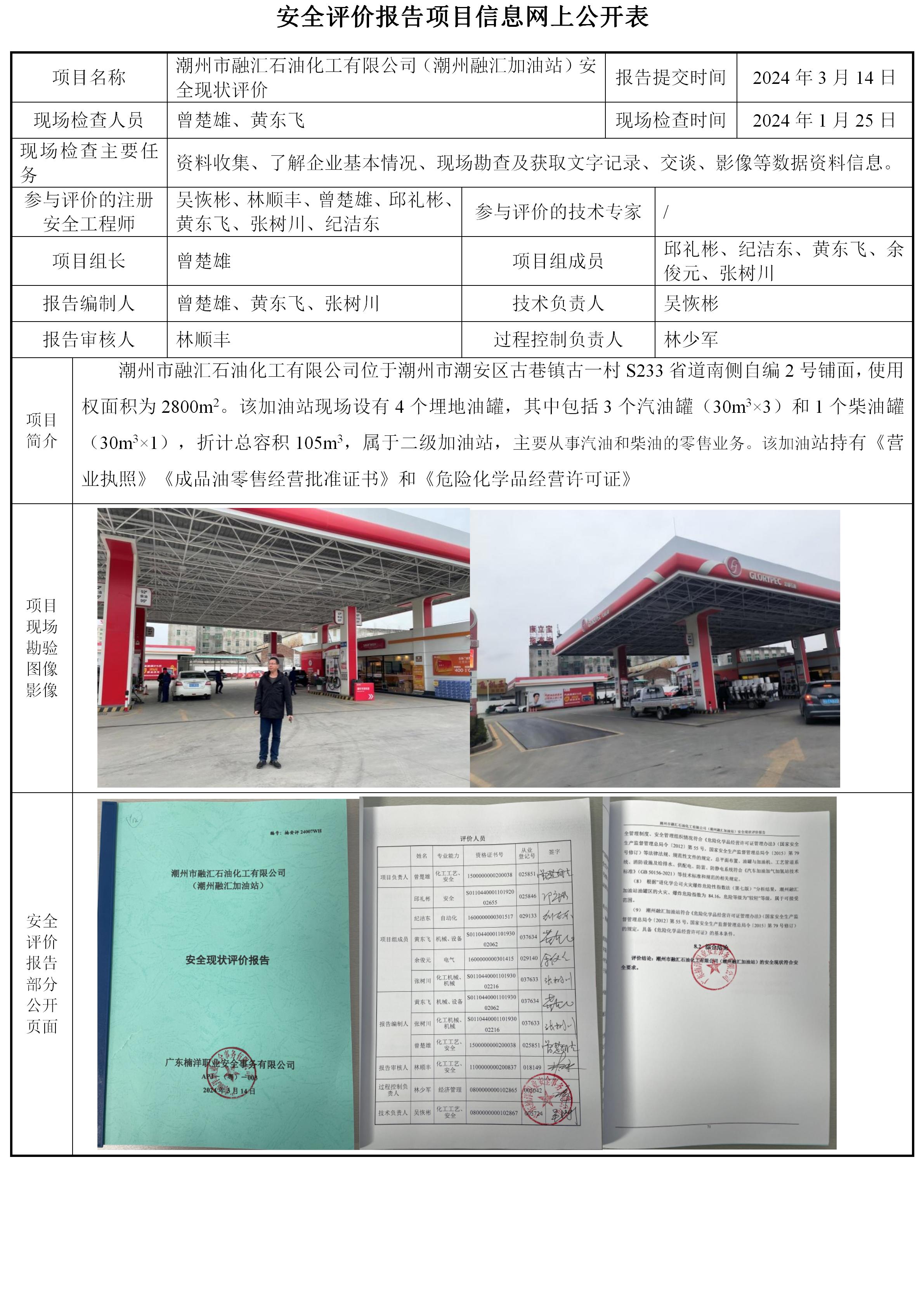 潮州市融汇石油化工有限公司(潮州融汇加油站)安全现状评价
