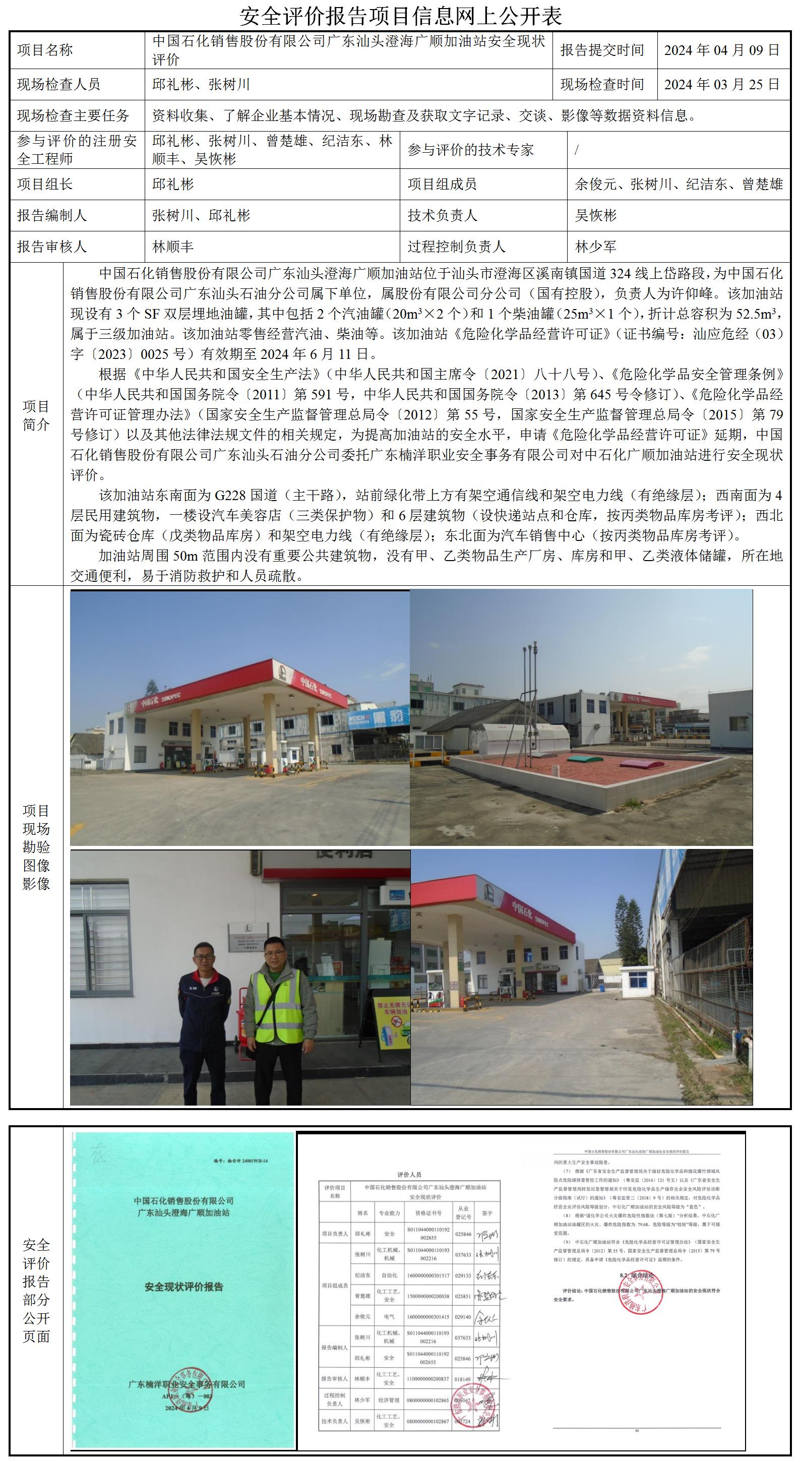 中国石化销售股份有限公司广东汕头澄海广顺加油站安全现状评价