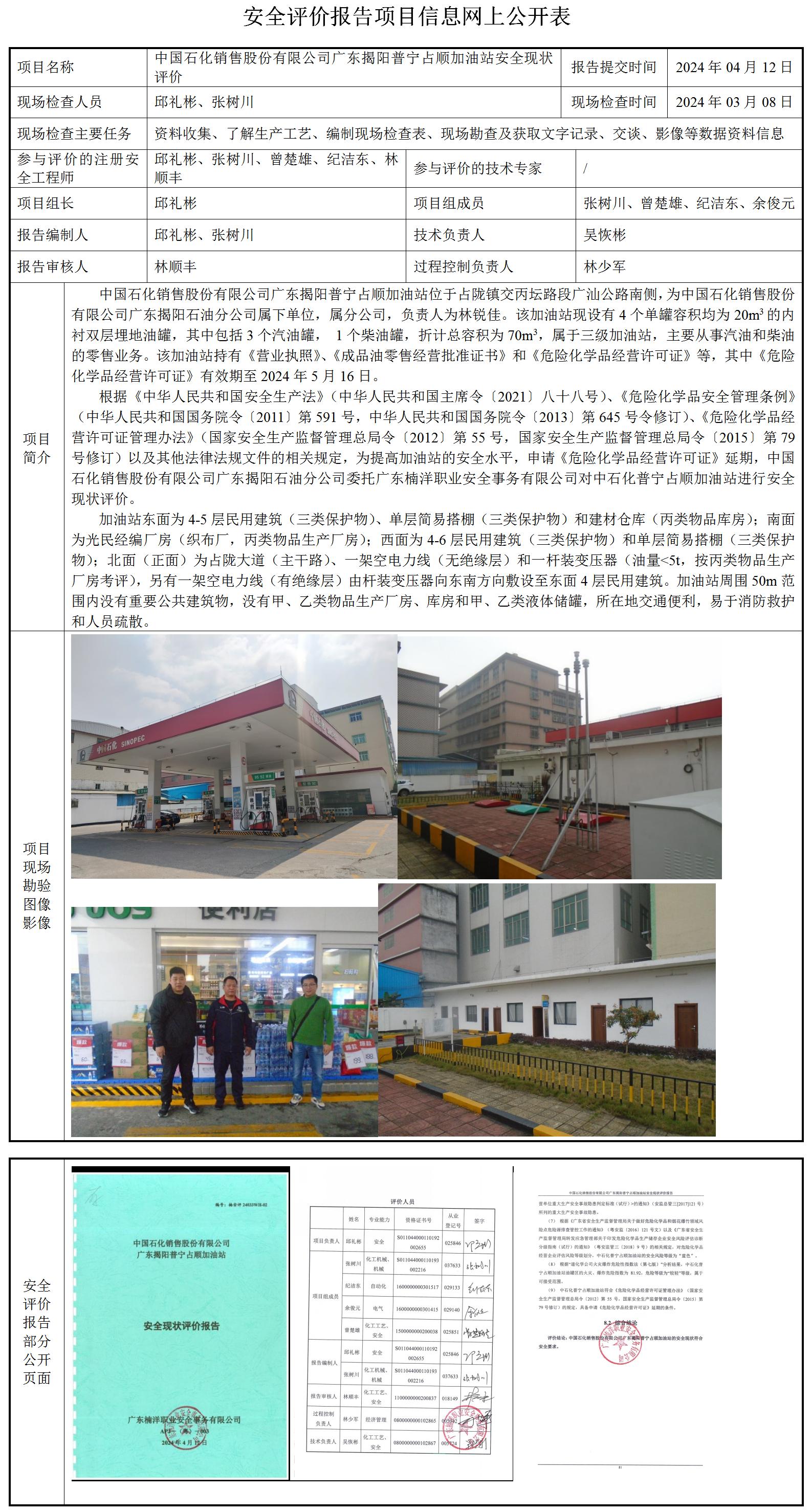 中国石化销售股份有限公司广东揭阳普宁占顺加油站安全现状评价