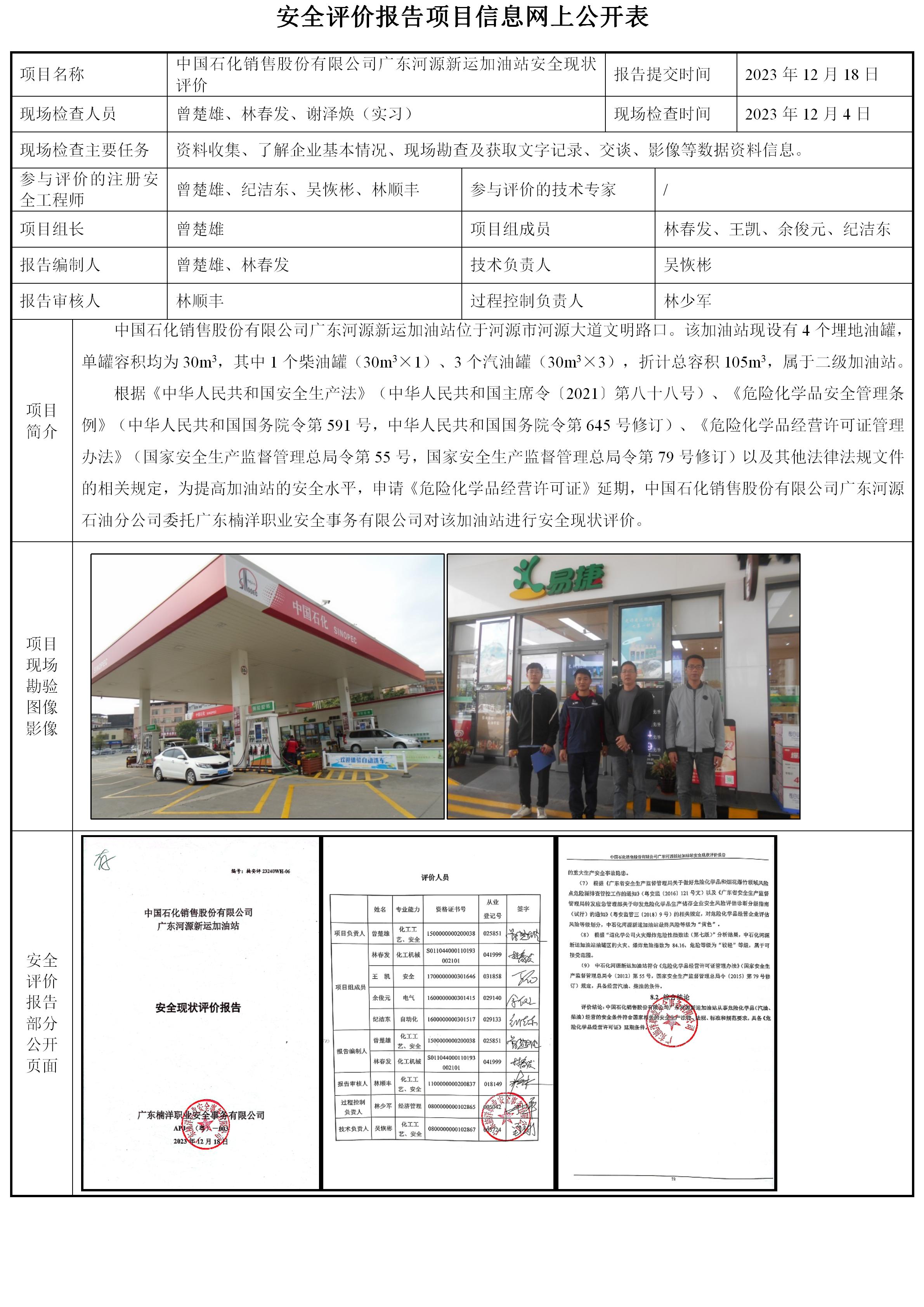 中国石化销售股份有限公司广东河源新运加油站安全现状评价