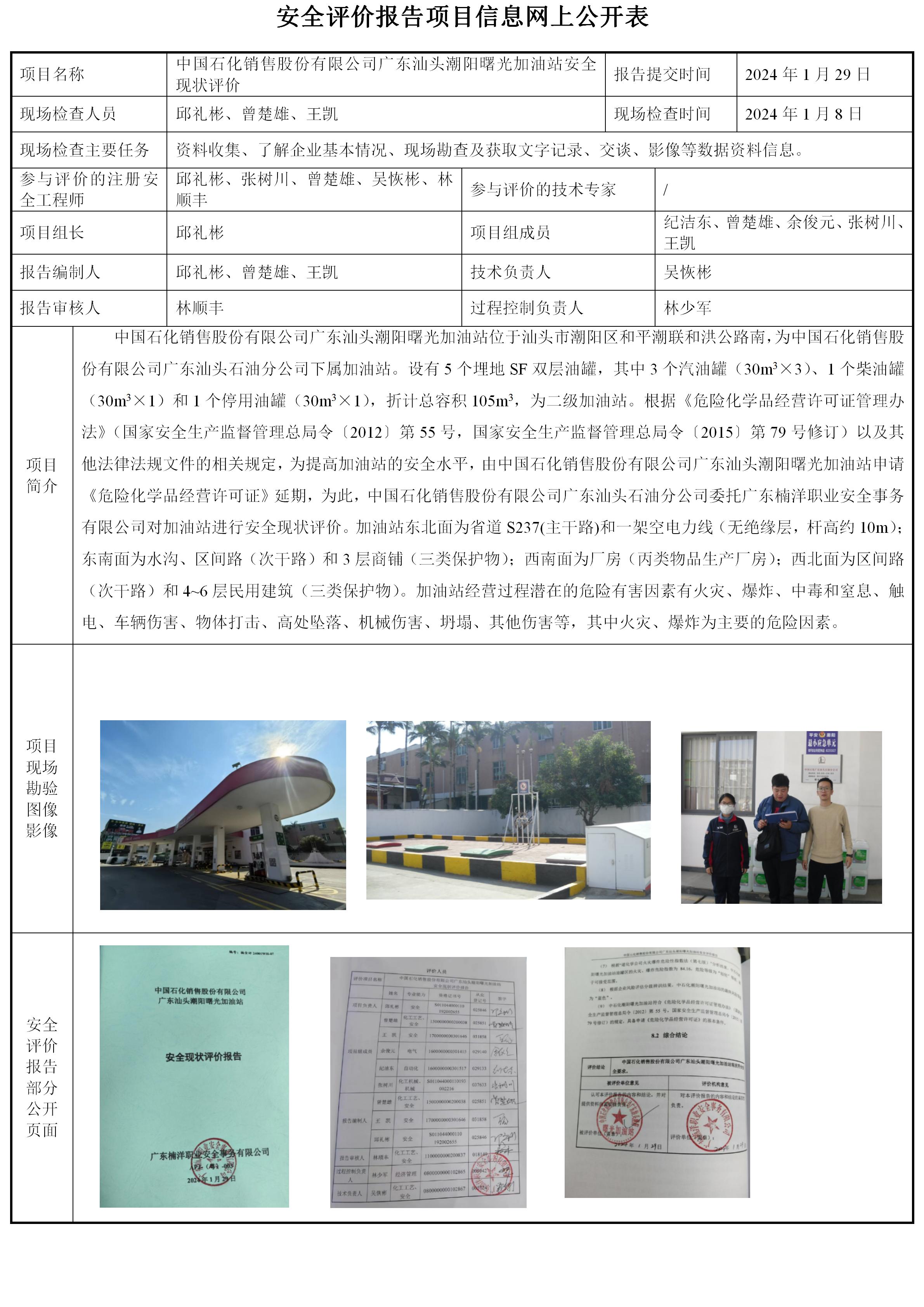 中国石化销售股份有限公司广东汕头潮阳曙光加油站安全现状评价