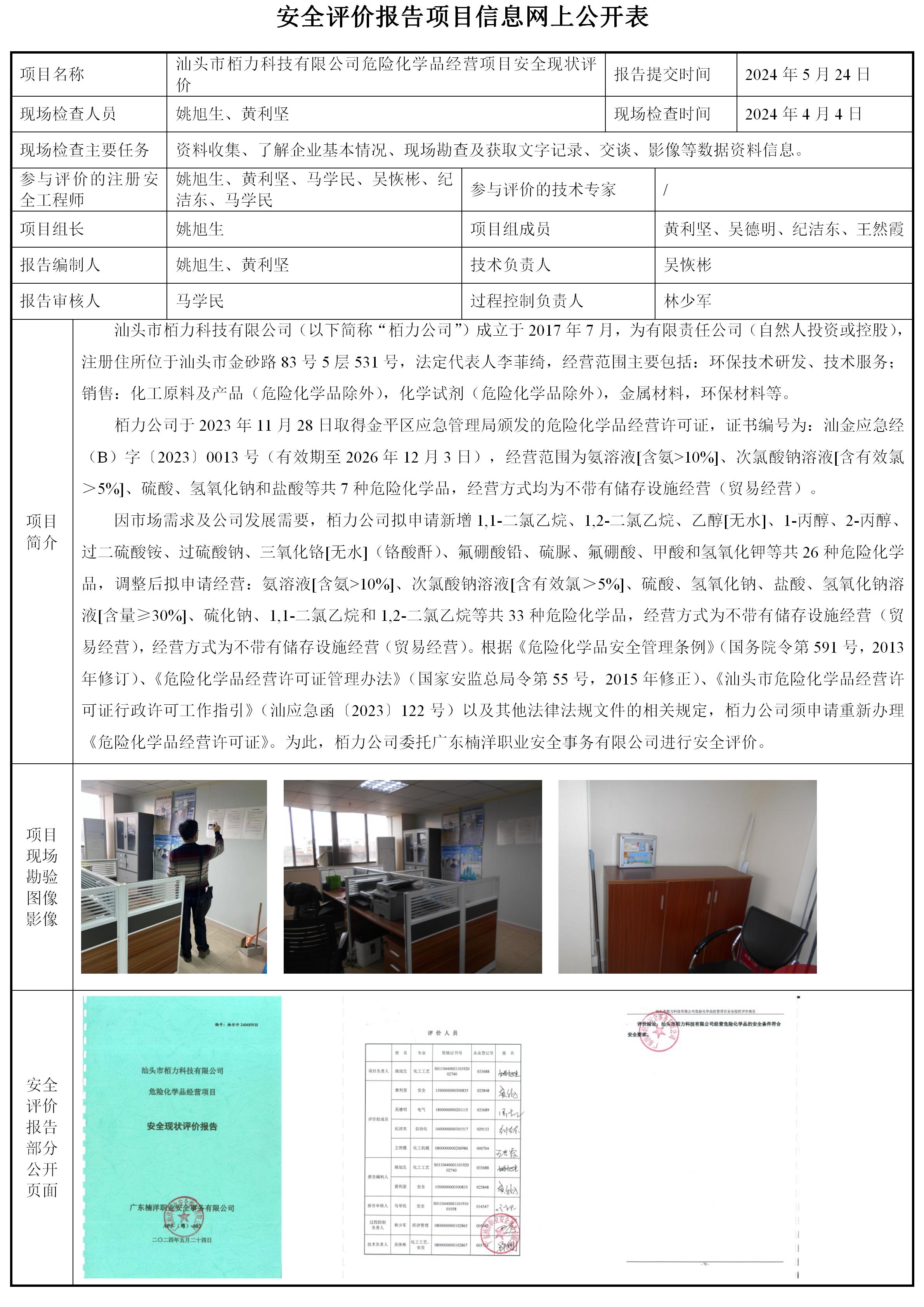 汕头市栢力科技有限公司危险化学品经营项目安全现状评价