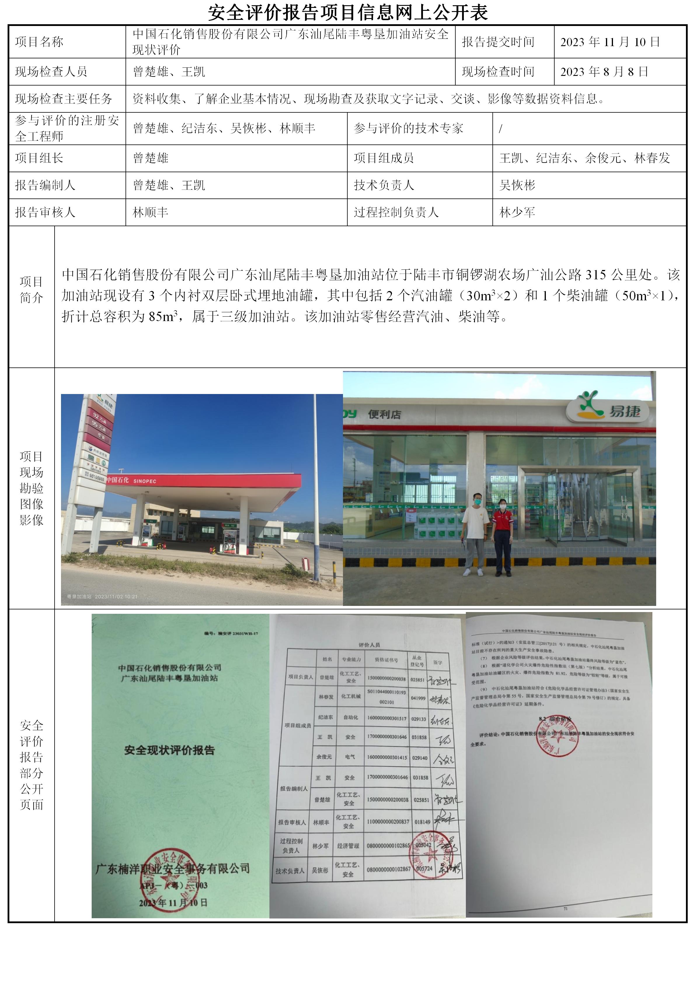 中国石化销售股份有限公司广东汕尾陆丰粤垦加油站安全现状评价