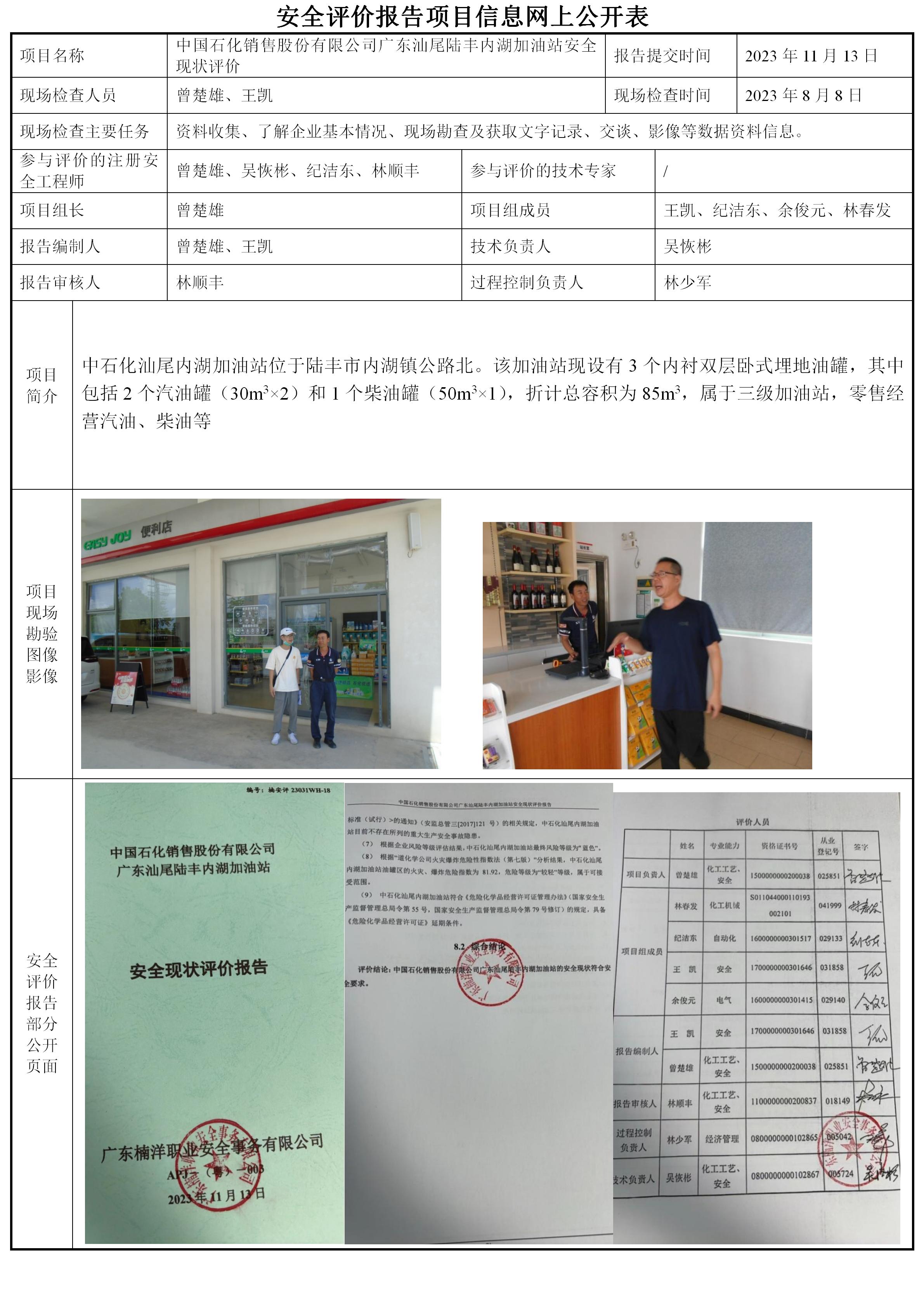 中国石化销售股份有限公司广东汕尾陆丰内湖加油站安全现状评价