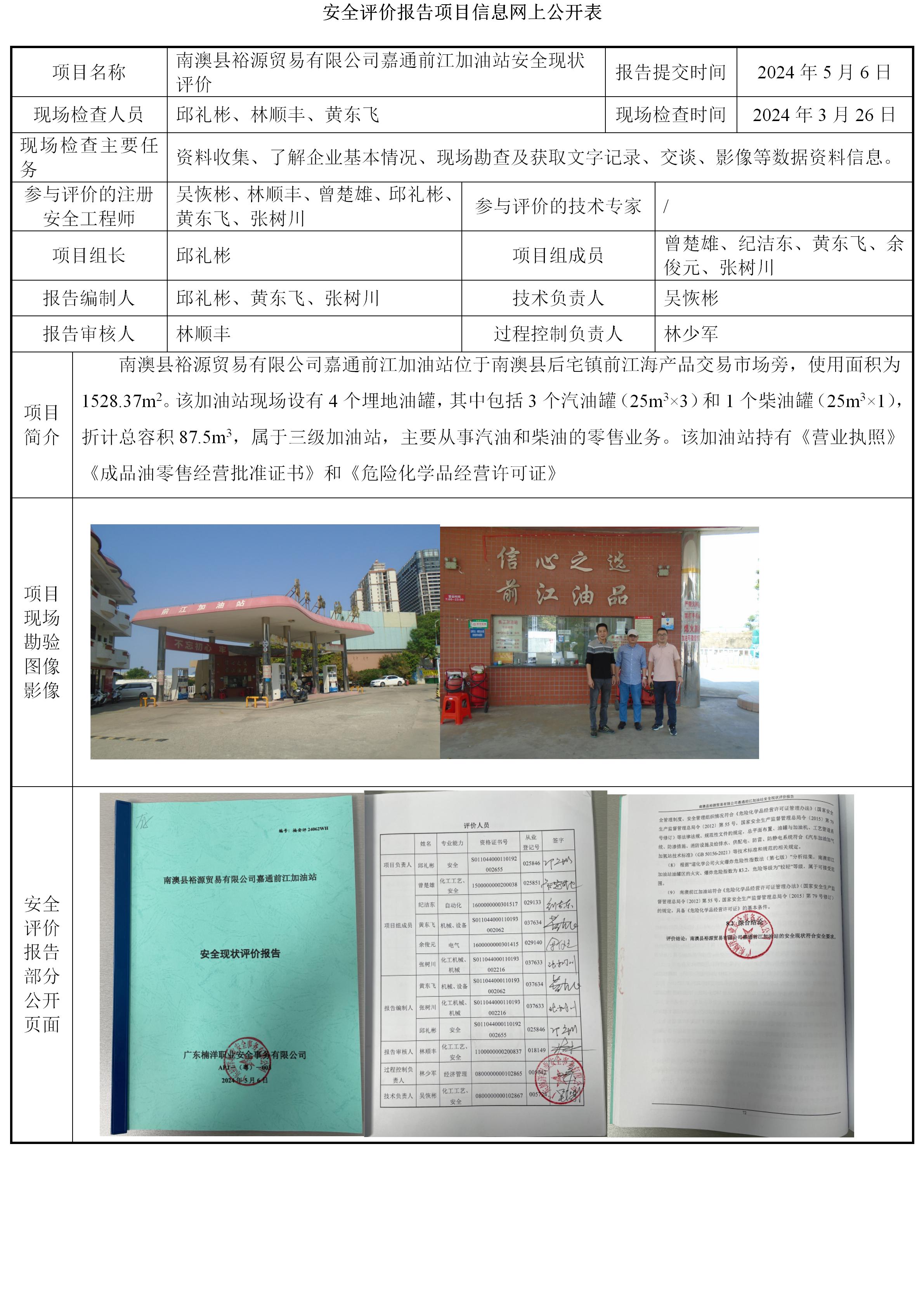 南澳县裕源贸易有限公司嘉通前江加油站安全现状评价