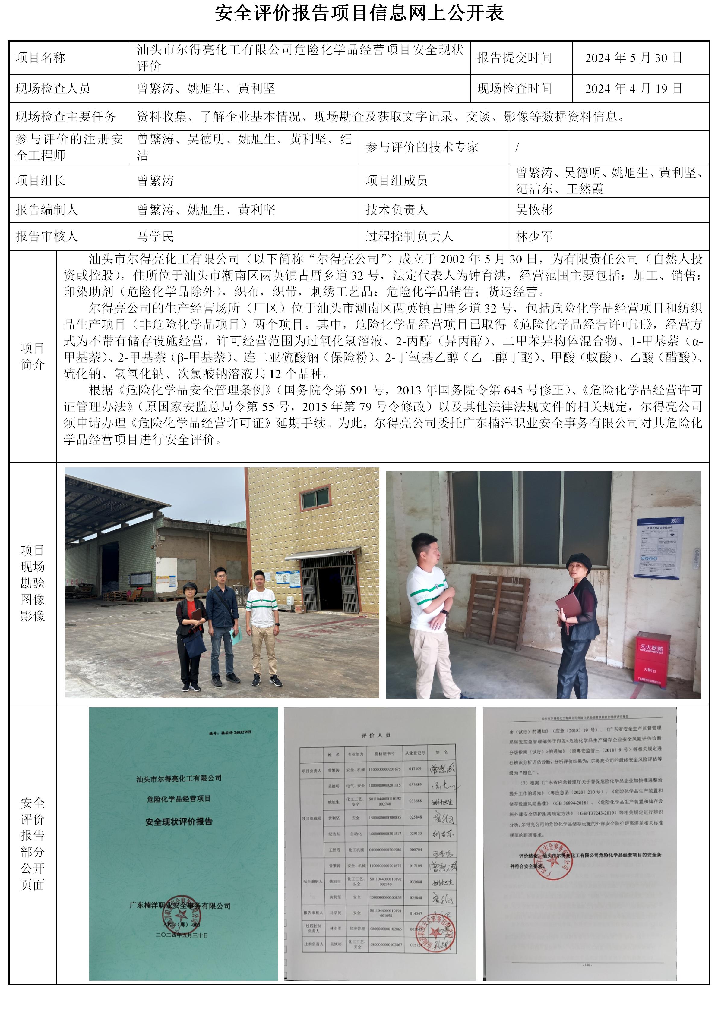 汕头市尔得亮化工有限公司危险化学品经营项目安全现状评价