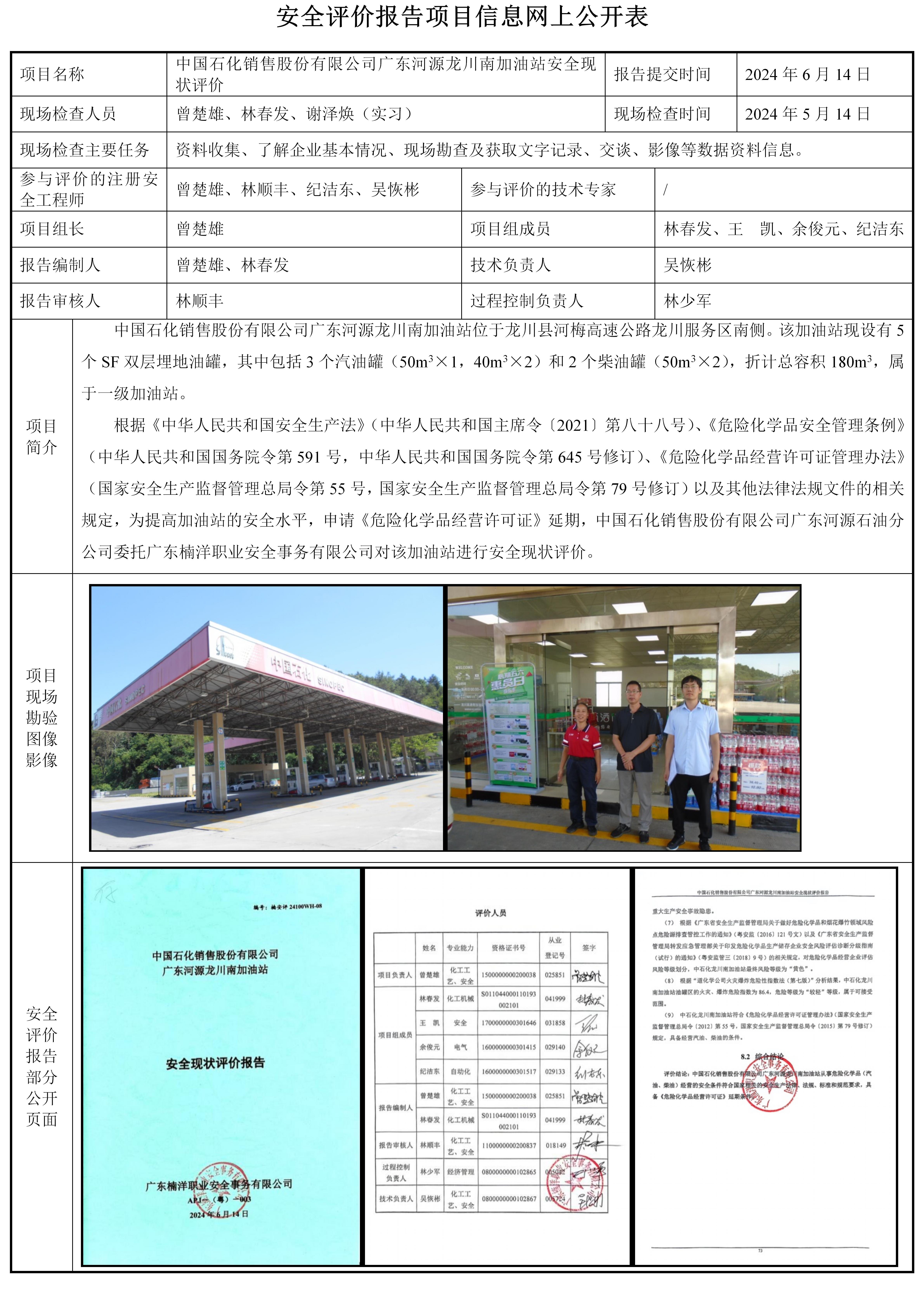 中国石化销售股份有限公司广东河源龙川南加油站安全现状评价