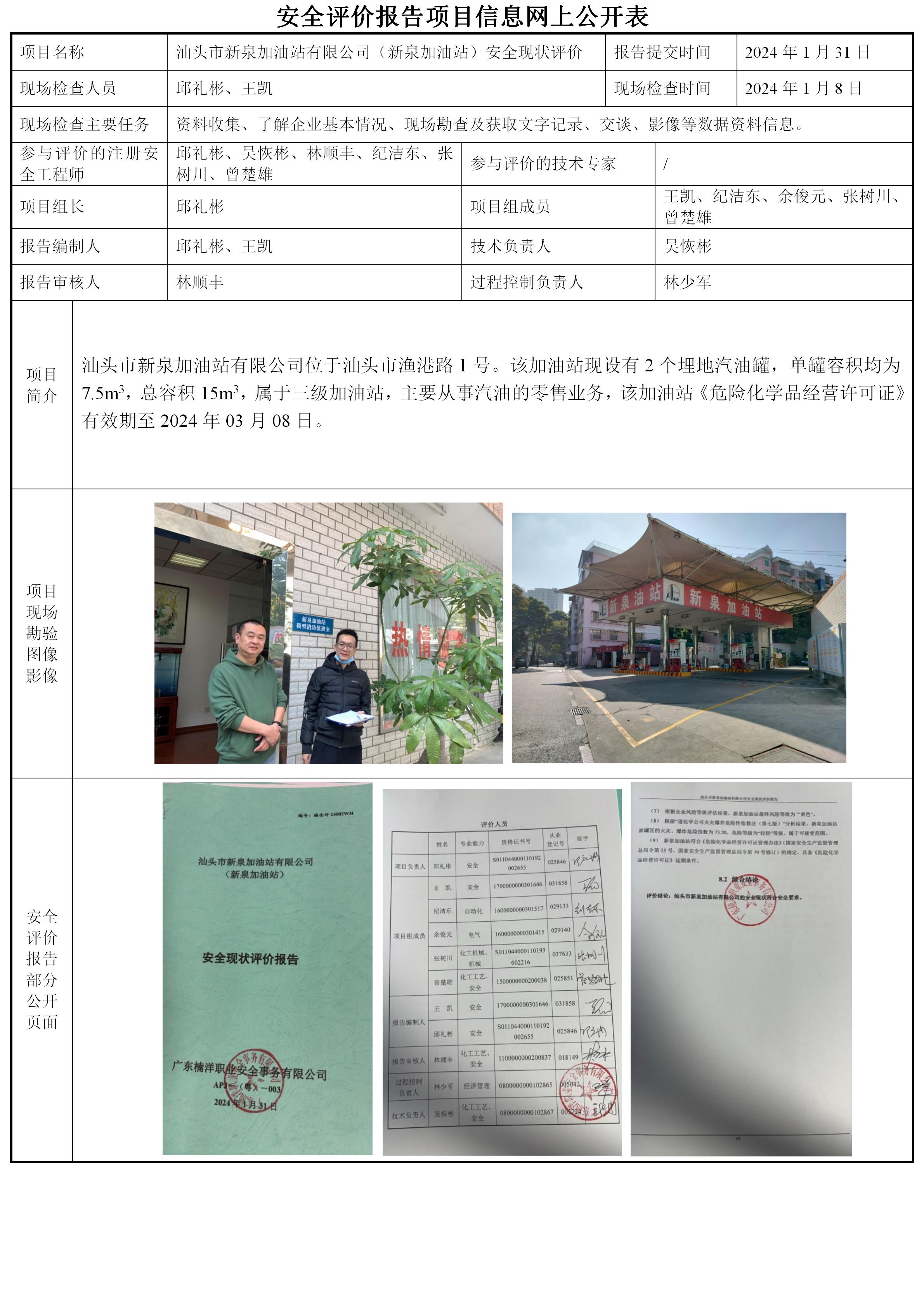 汕头市新泉加油站有限公司(新泉加油站)安全现状评价