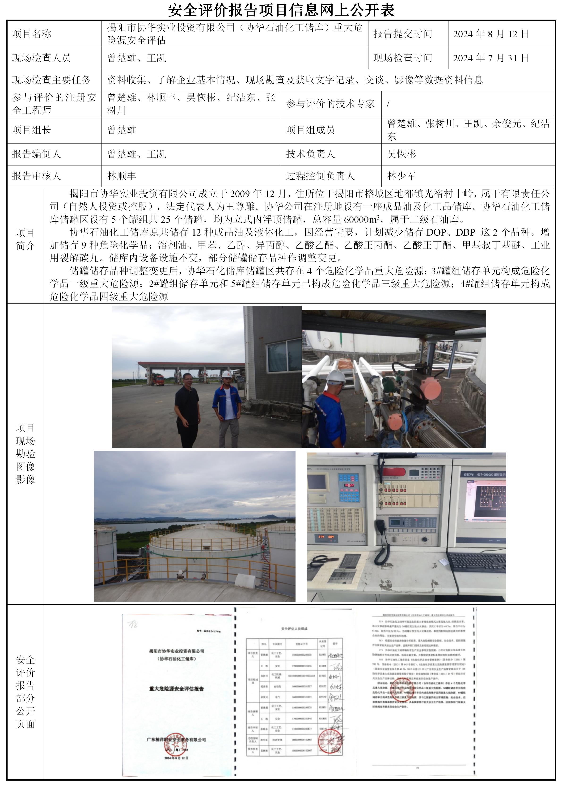 揭阳市协华实业投资有限公司(协华石油化工储库)重大危险源安全评估