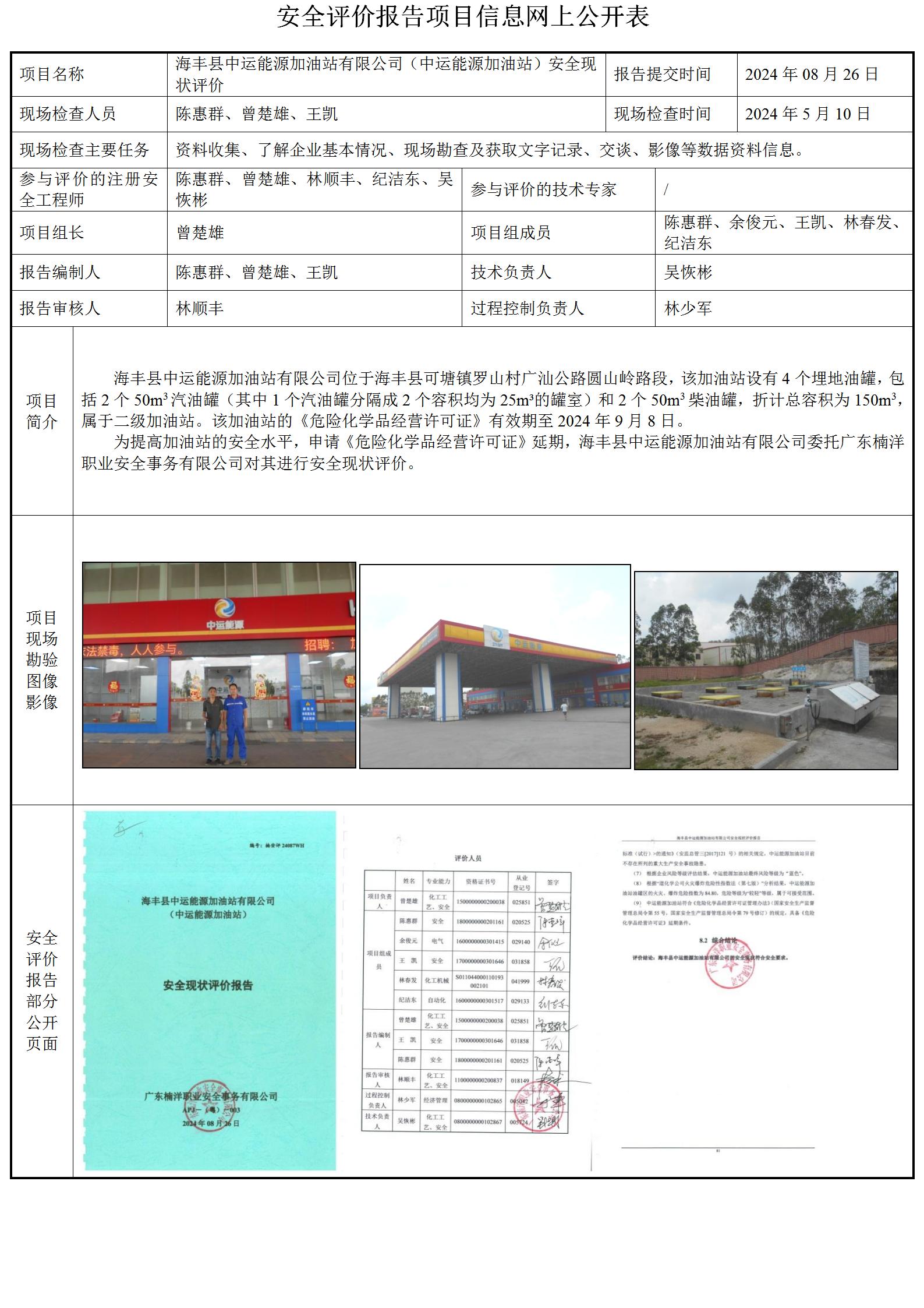海丰县中运能源加油站有限公司(中运能源加油站)安全现状评价