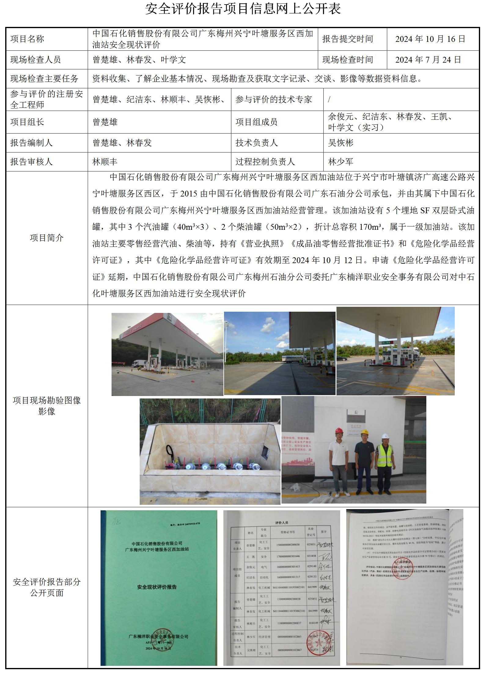 中国石化销售股份有限公司广东梅州兴宁叶塘服务区西加油站安全现状评价