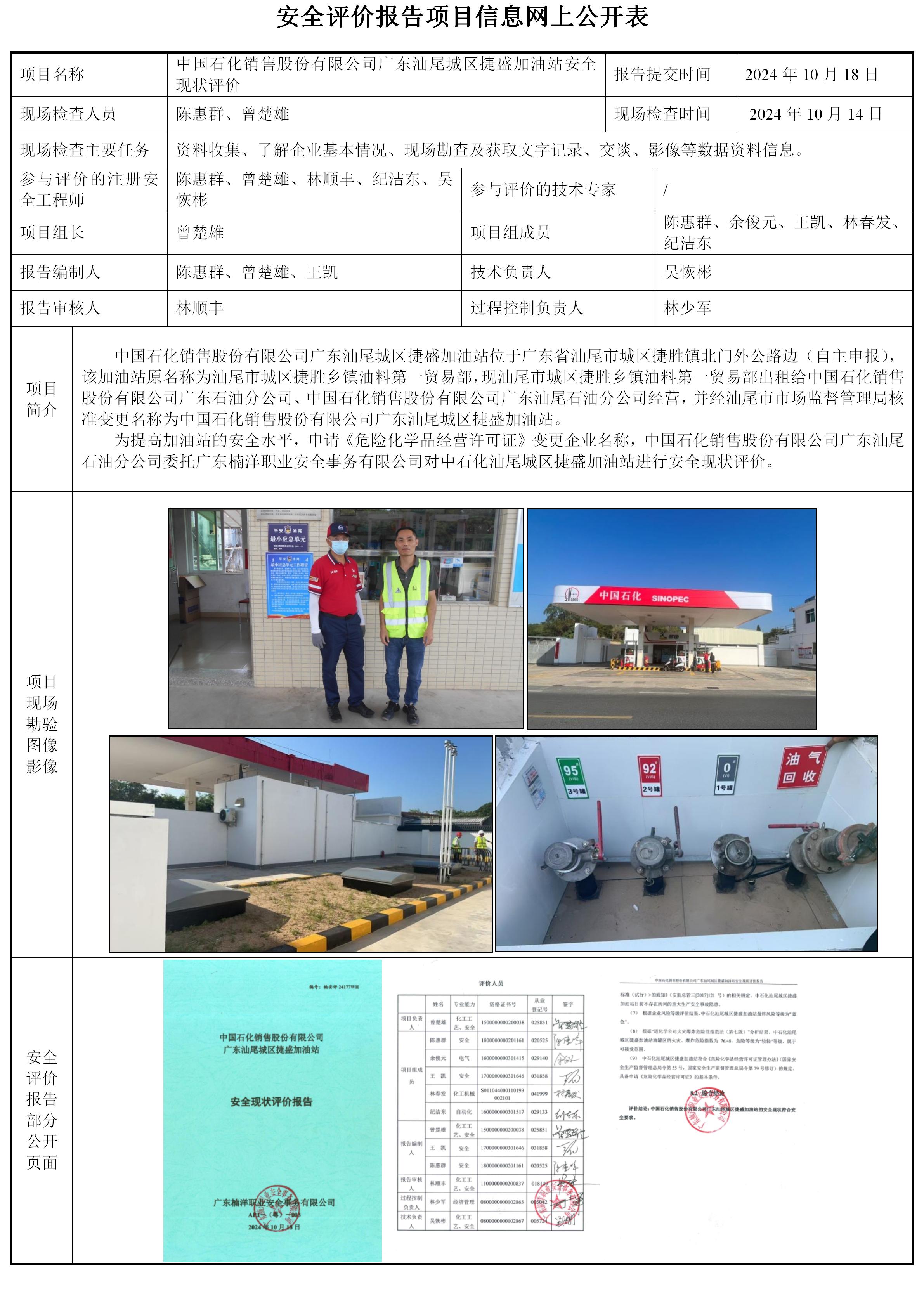 中国石化销售股份有限公司广东汕尾城区捷盛加油站安全现状评价