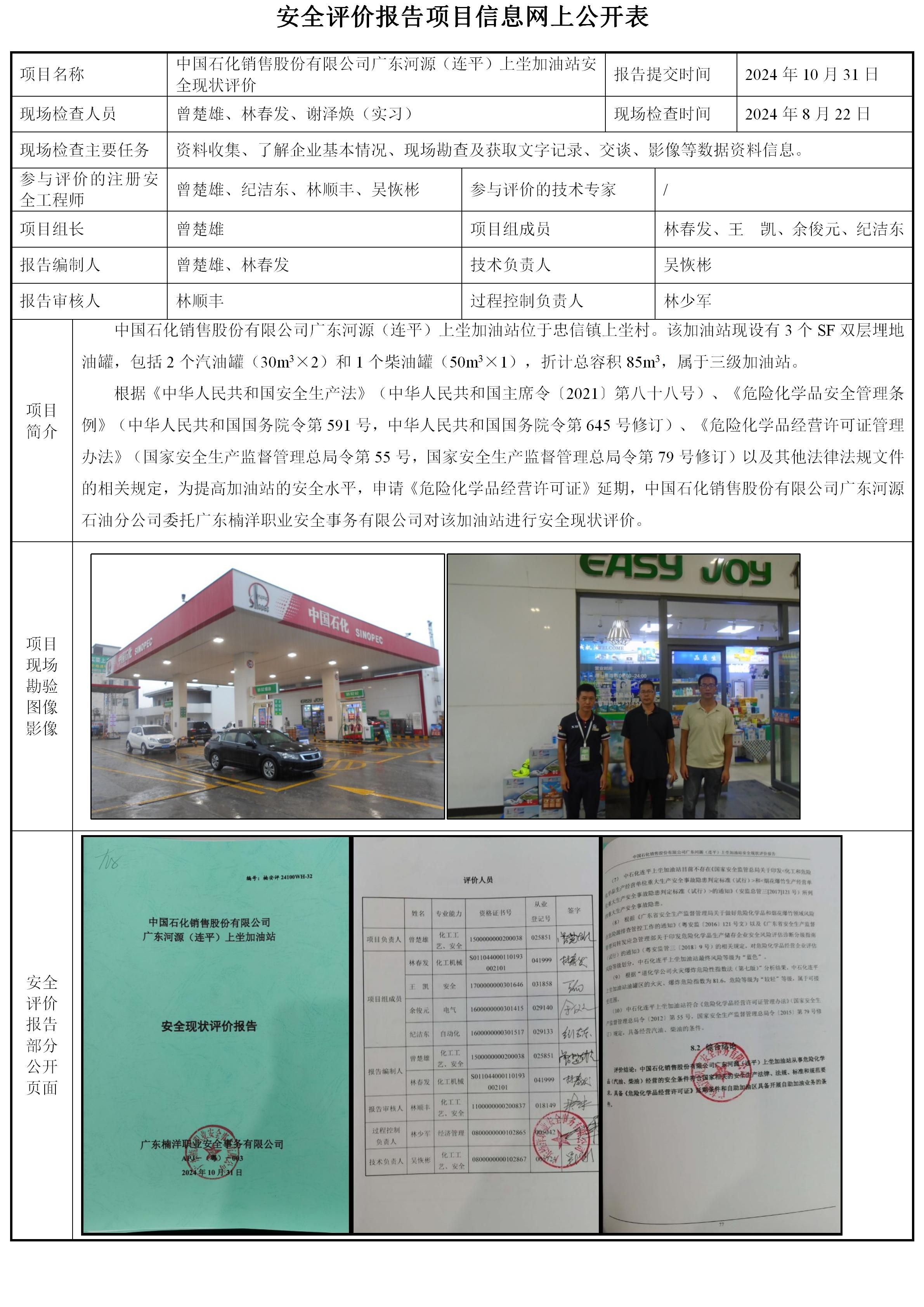 中国石化销售股份有限公司广东河源(连平)上坣加油站安全现状评价