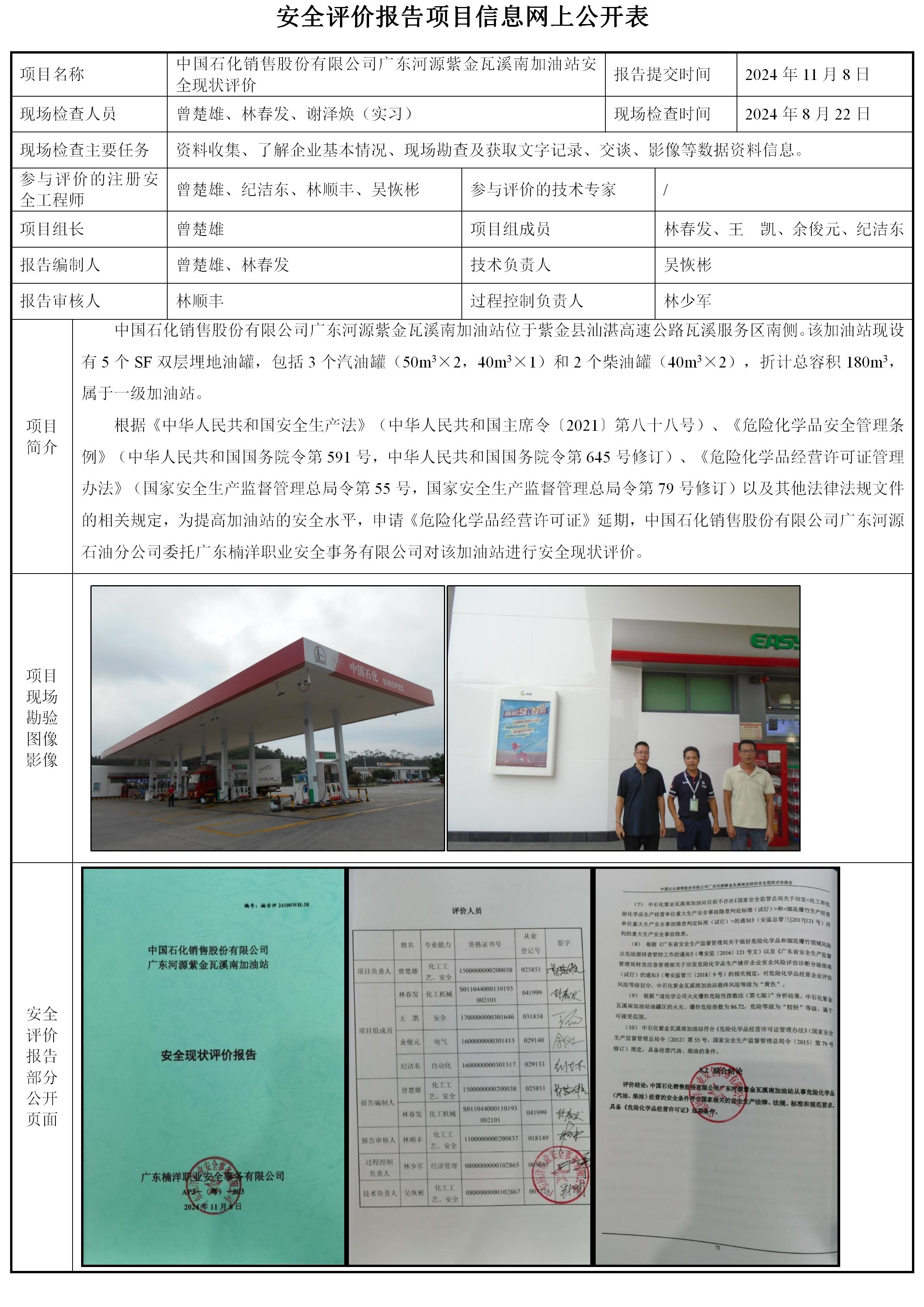 中国石化销售股份有限公司广东河源紫金瓦溪南加油站安全现状评价