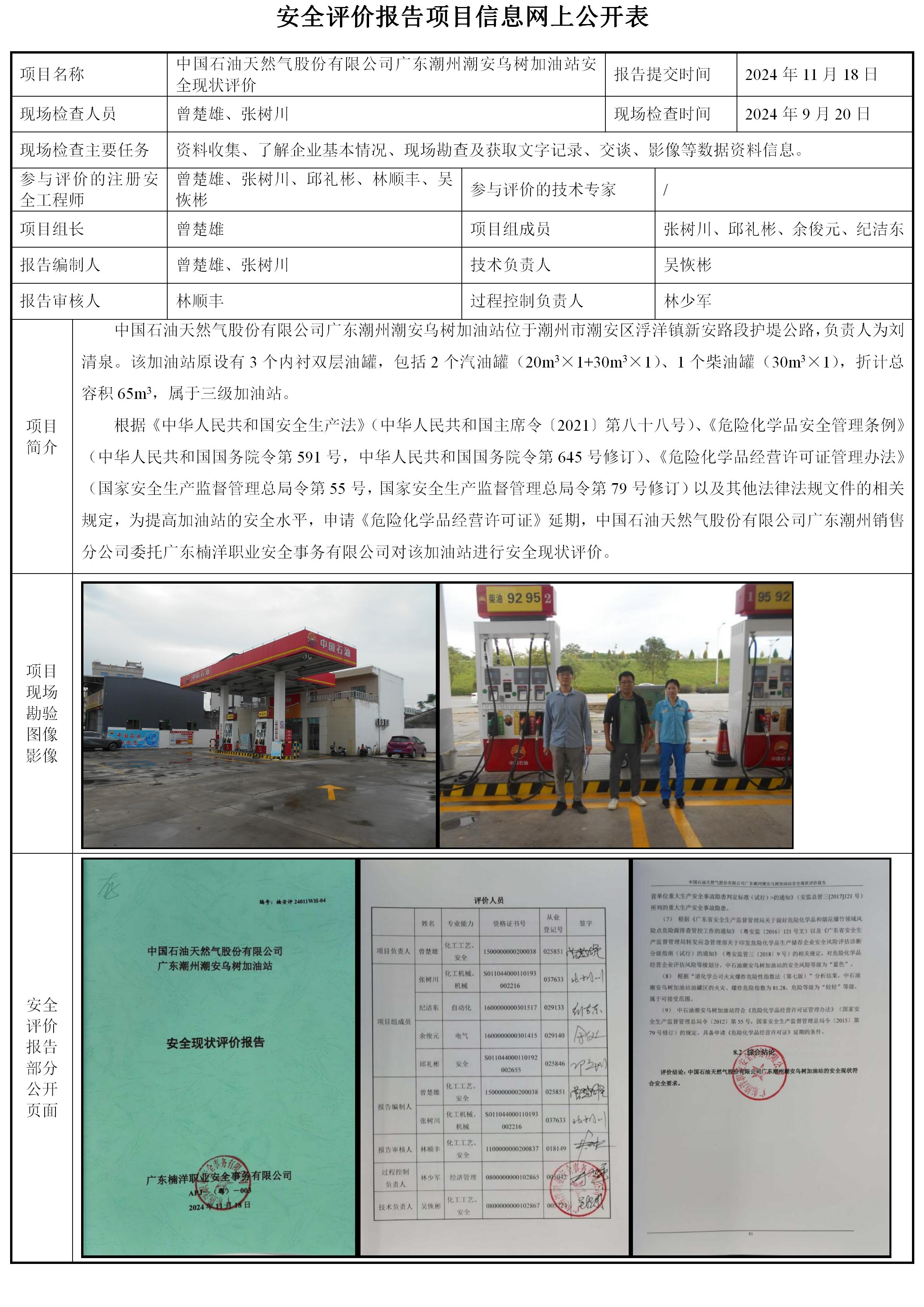 中国石油天然气股份有限公司广东潮州潮安乌树加油站安全现状评价