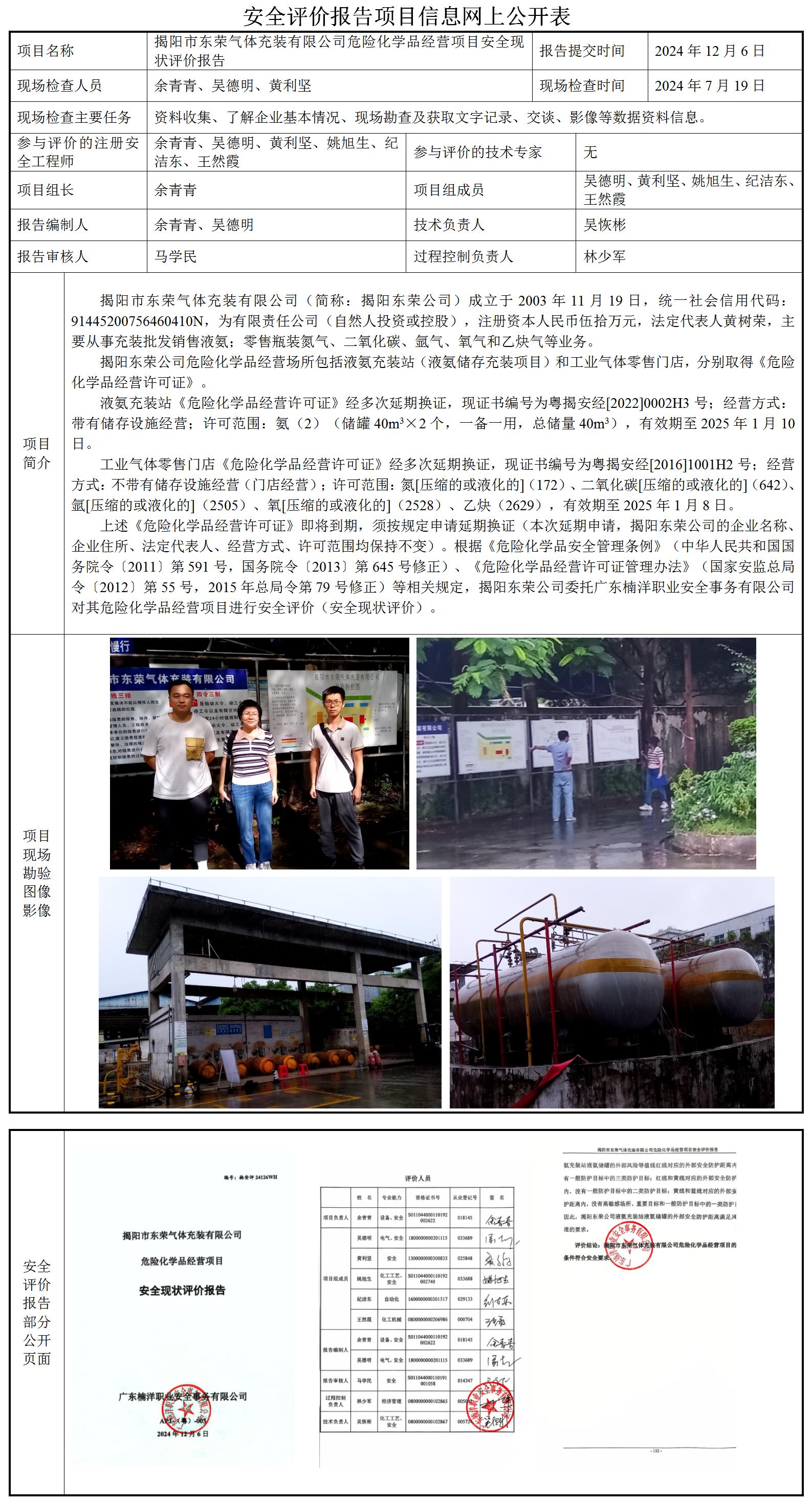 揭阳市东荣气体充装有限公司危险化学品经营项目安全现状评价