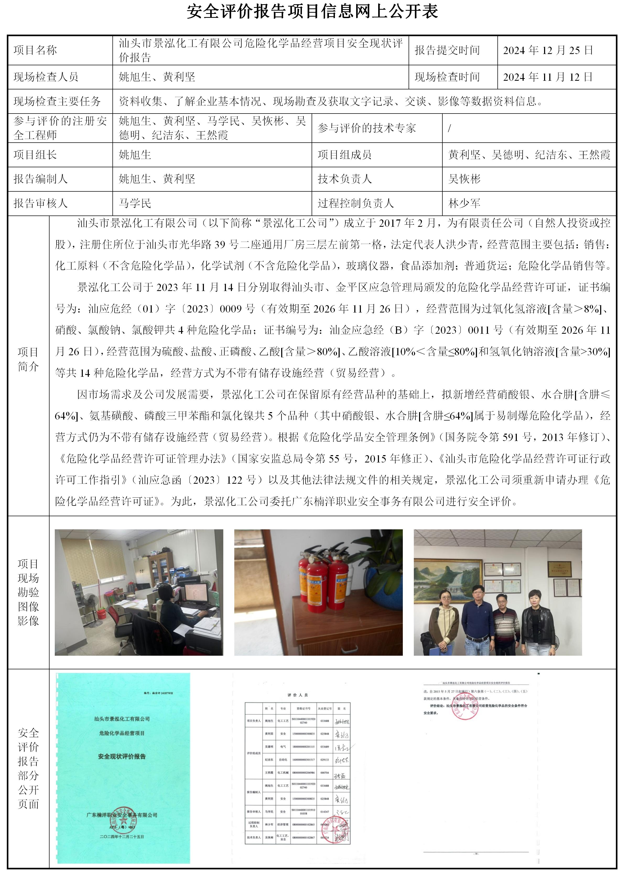 汕头市景泓化工有限公司经营危险化学品安全现状评价