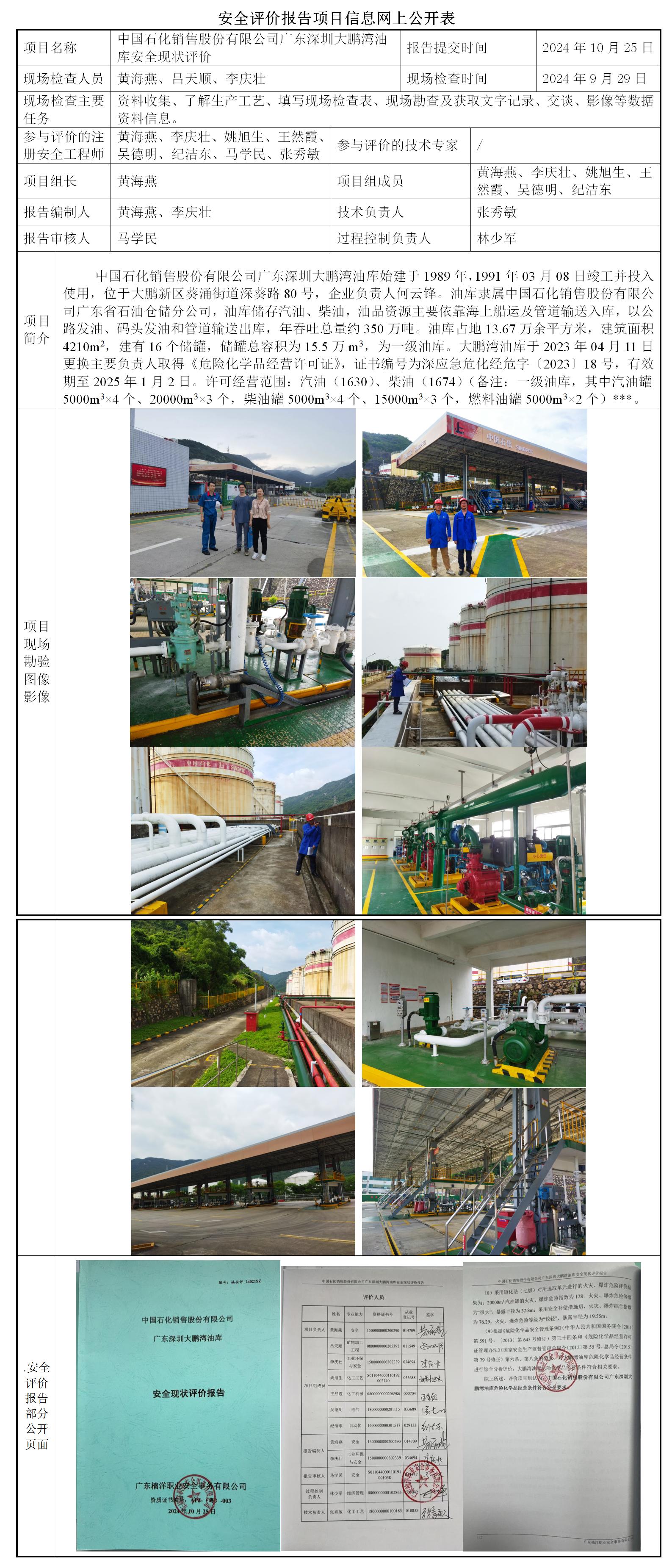 中国石化销售股份有限公司广东深圳大鹏湾油库安全现状评价