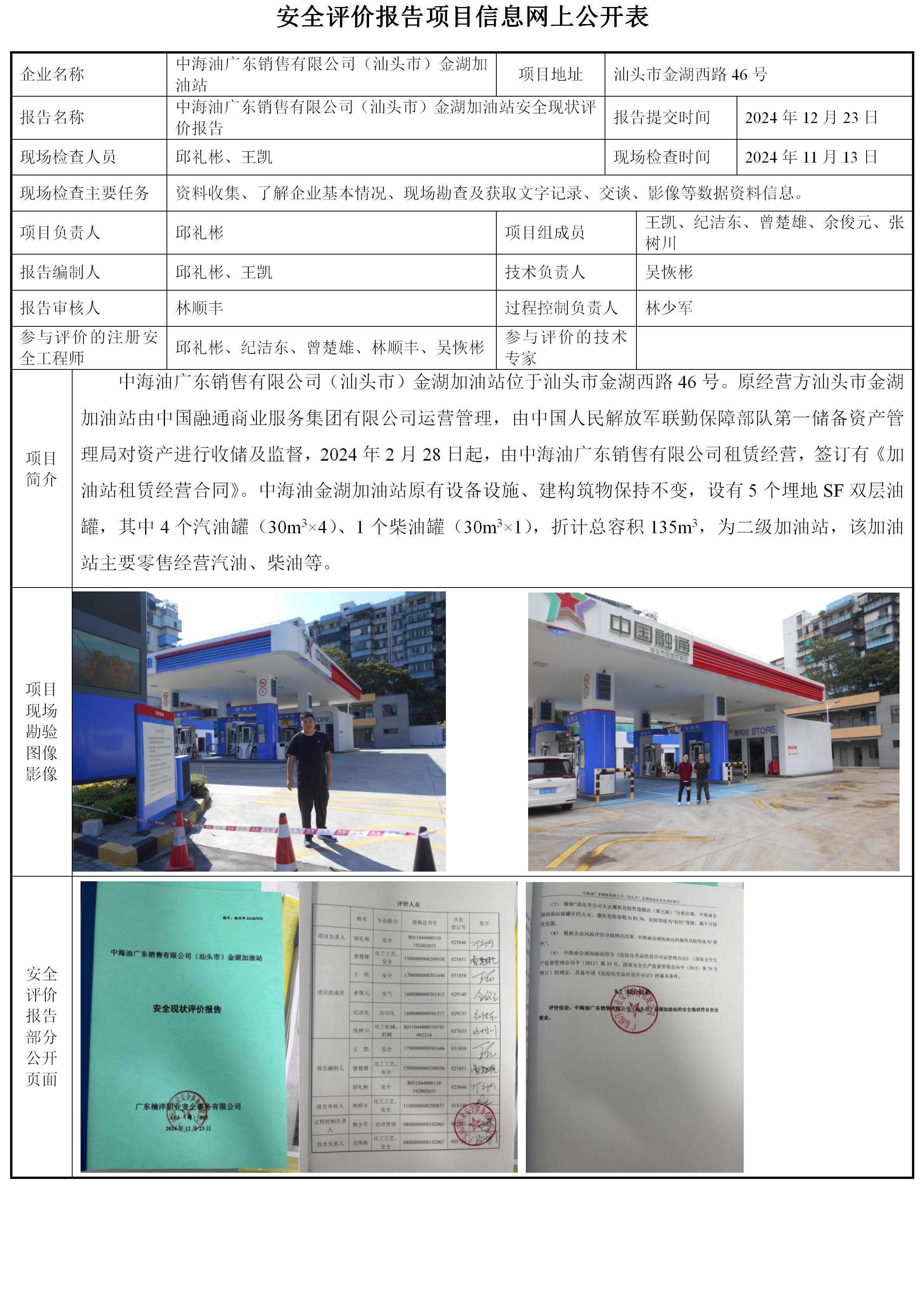 中海油广东销售有限公司(汕头市)金湖加油站安全现状评价
