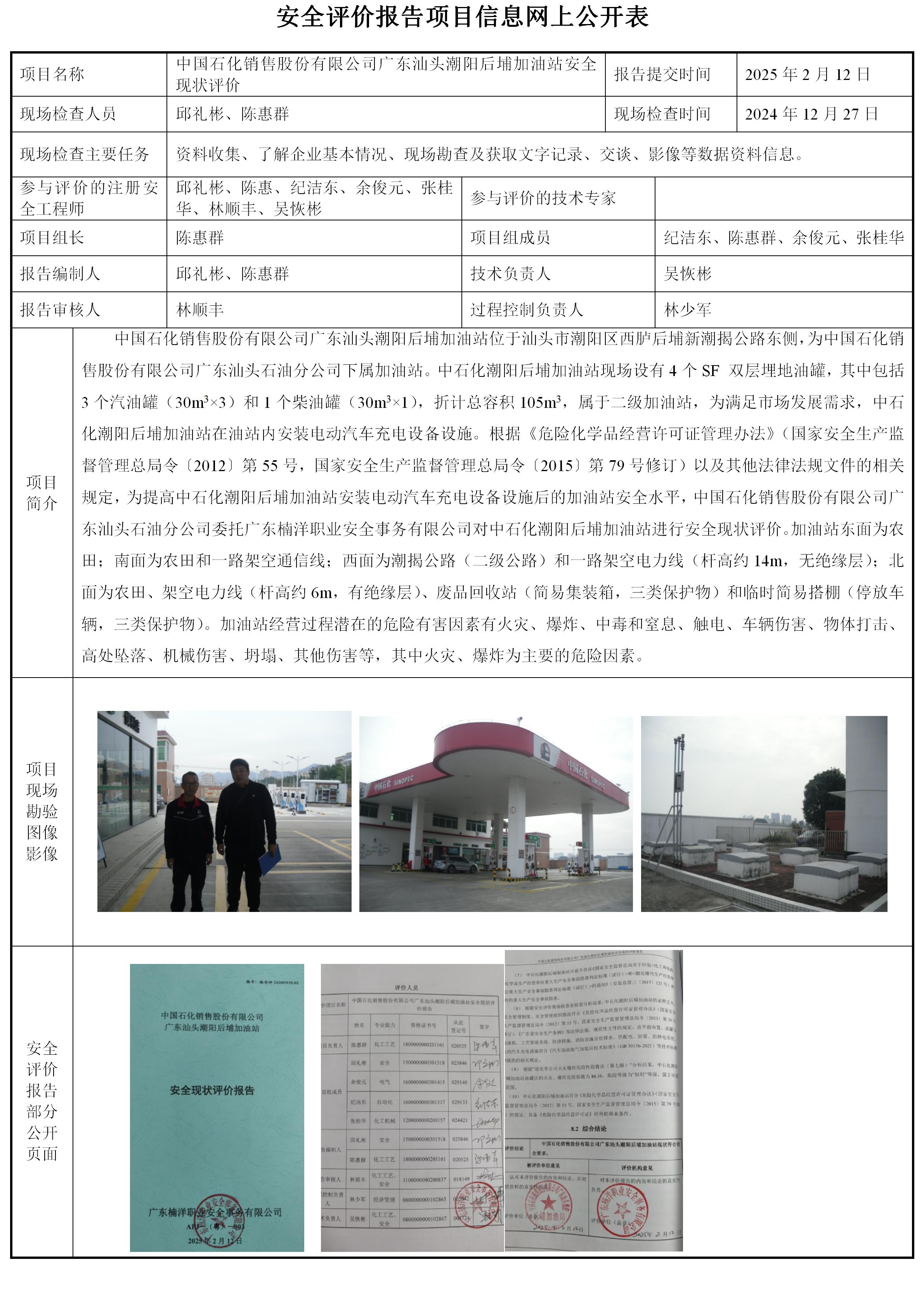 中国石化销售股份有限公司广东汕头潮阳后埔加油站安全现状评价