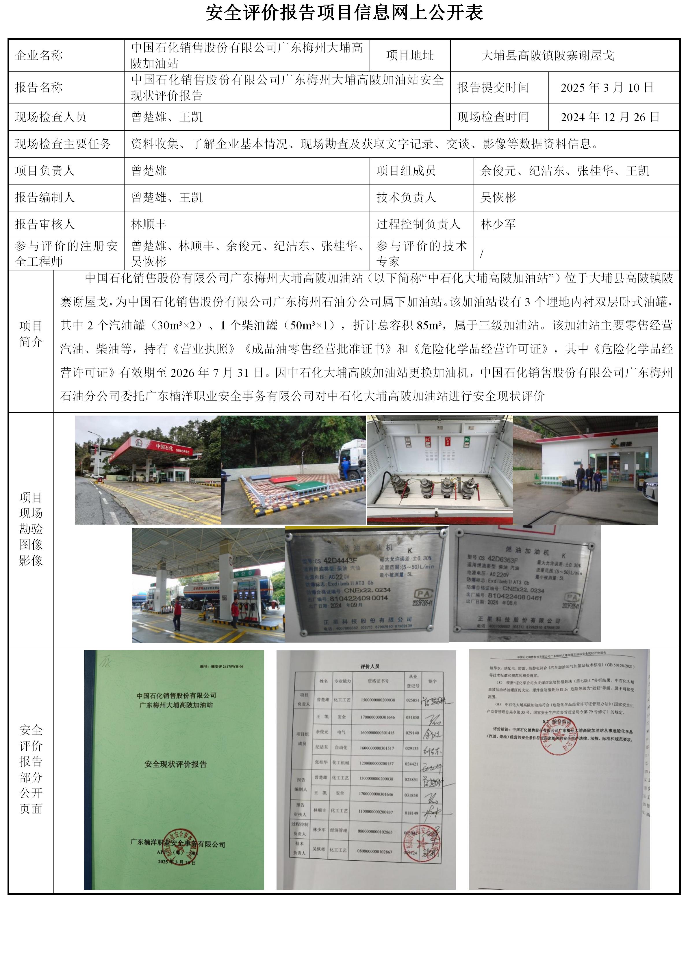 中国石化销售股份有限公司广东梅州大埔高陂加油站安全现状评价