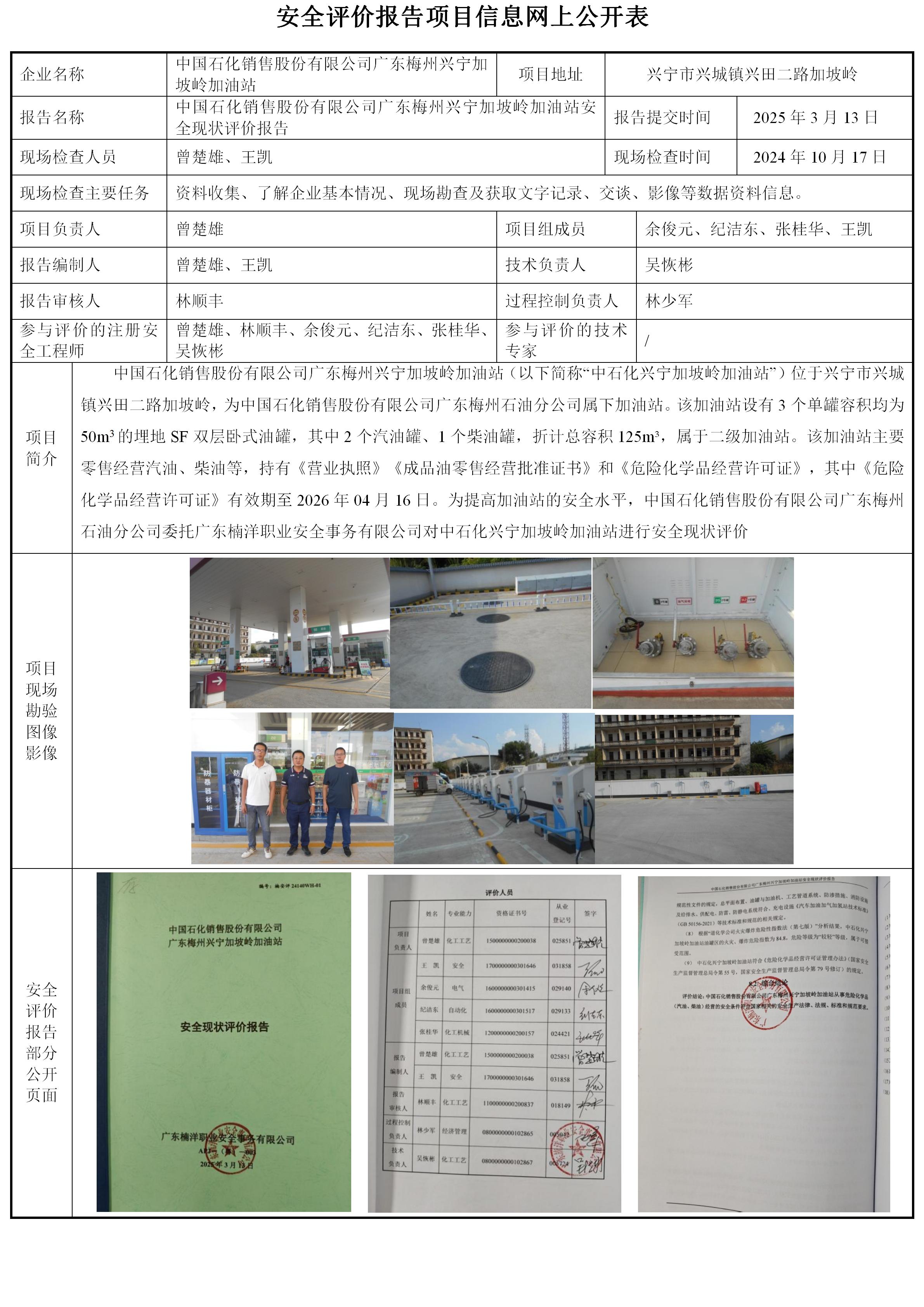 中国石化销售股份有限公司广东梅州兴宁加坡岭加油站安全现状评价