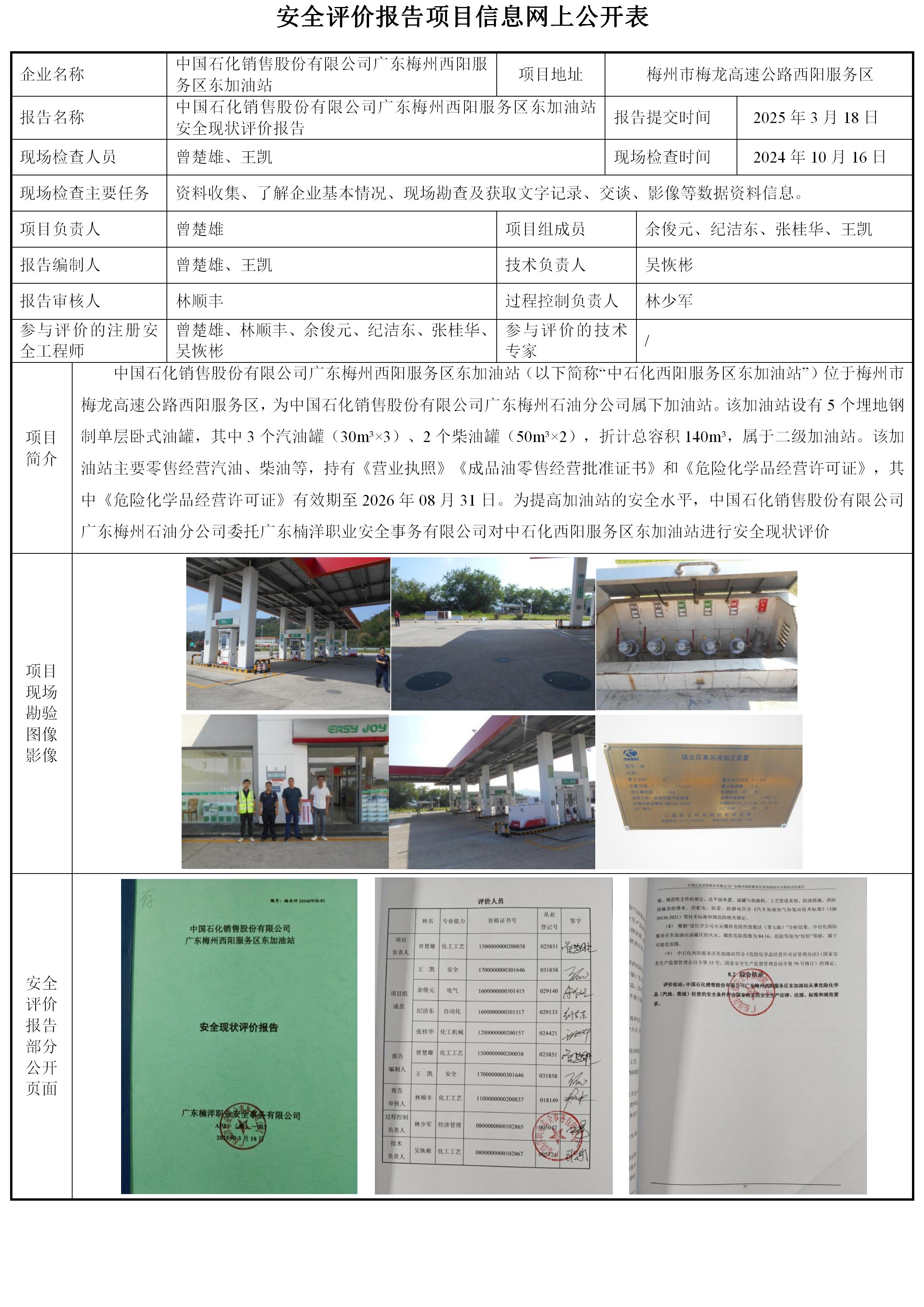中国石化销售股份有限公司广东梅州西阳服务区东加油站安全现状评价