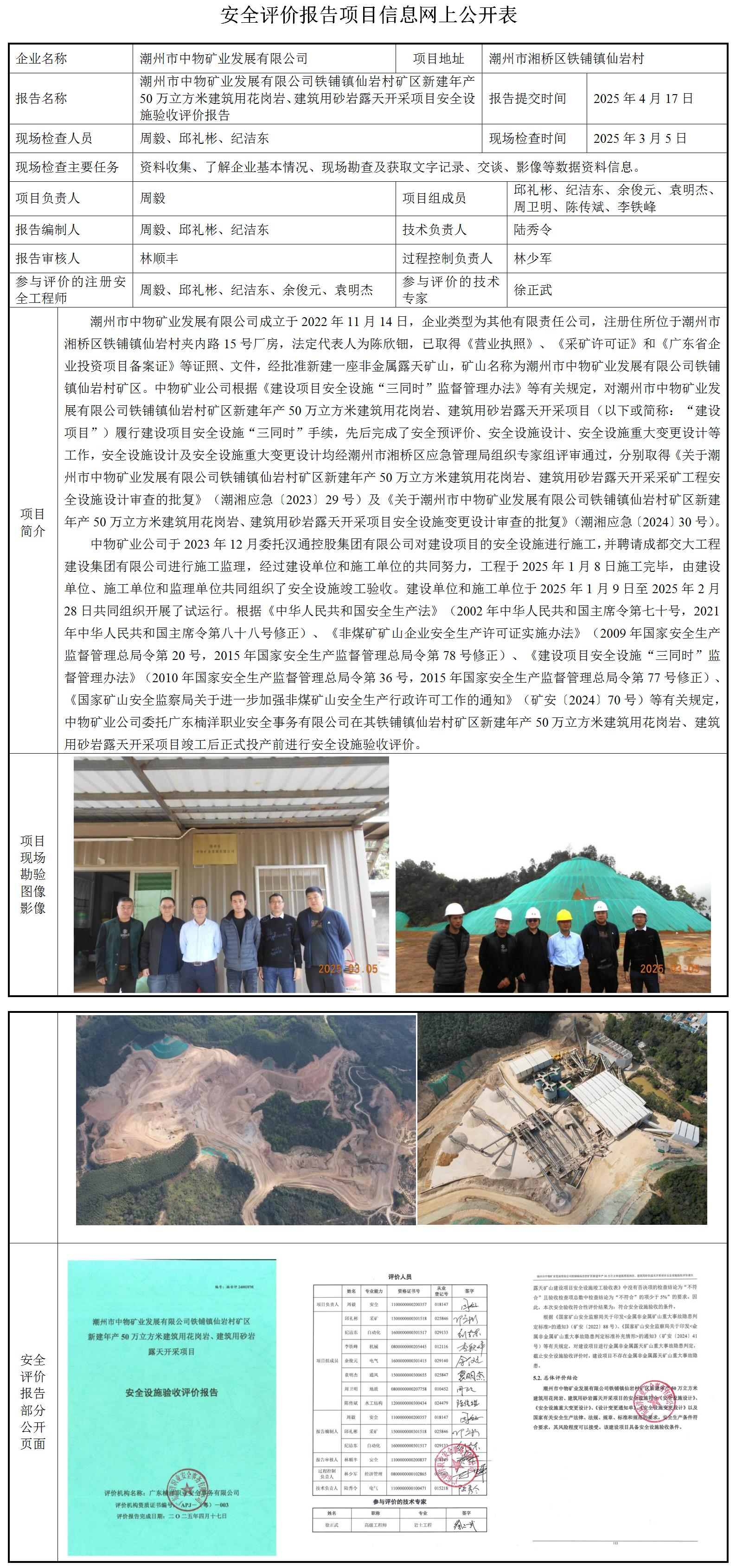 潮州市中物矿业发展有限公司铁铺镇仙岩村矿区新建年产50万立方米建筑用花岗岩、建筑用砂岩露天开采项目安全设施验收评价