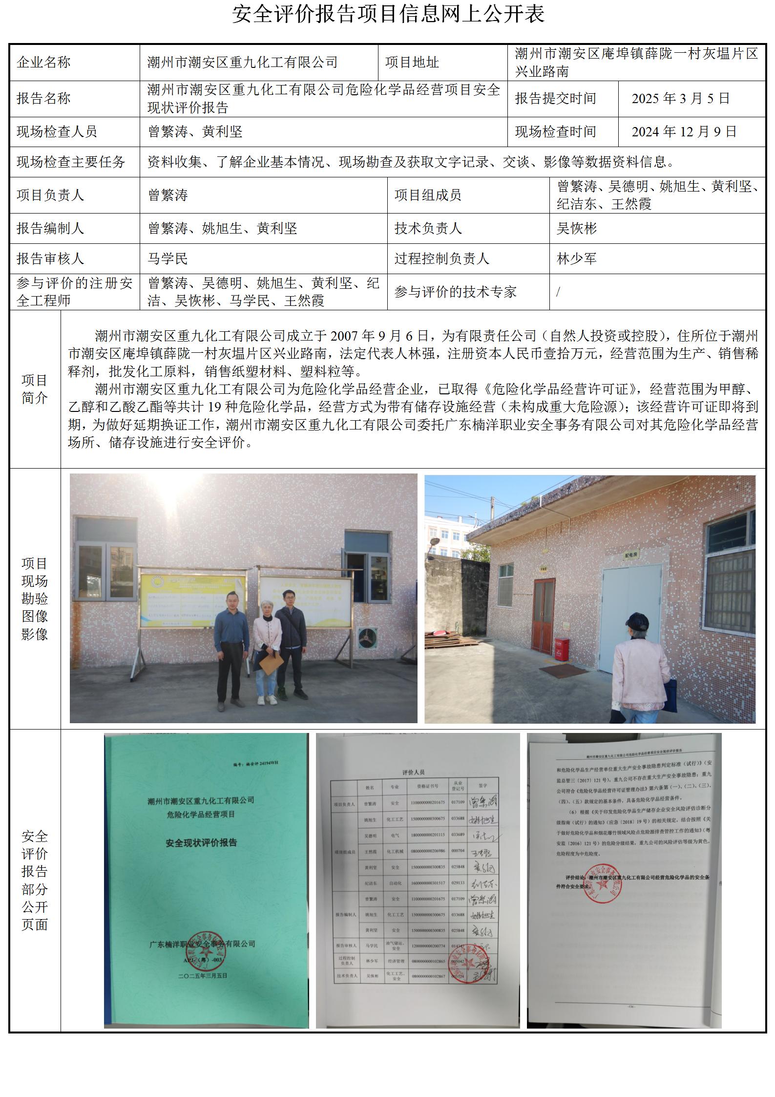 潮州市潮安区重九化工有限公司危险化学品经营项目安全现状评价